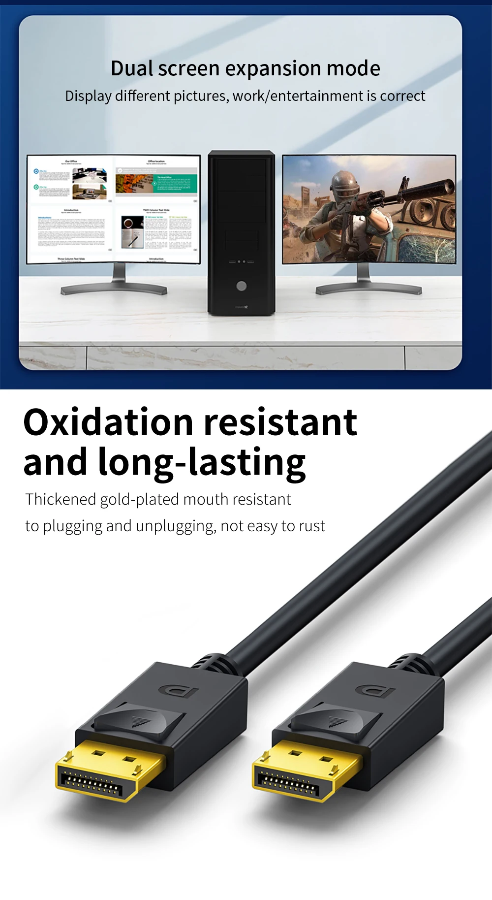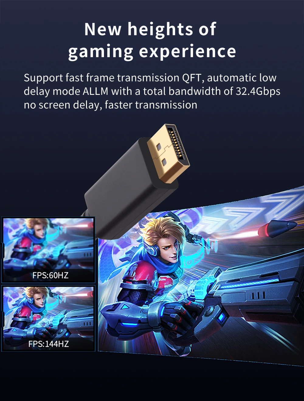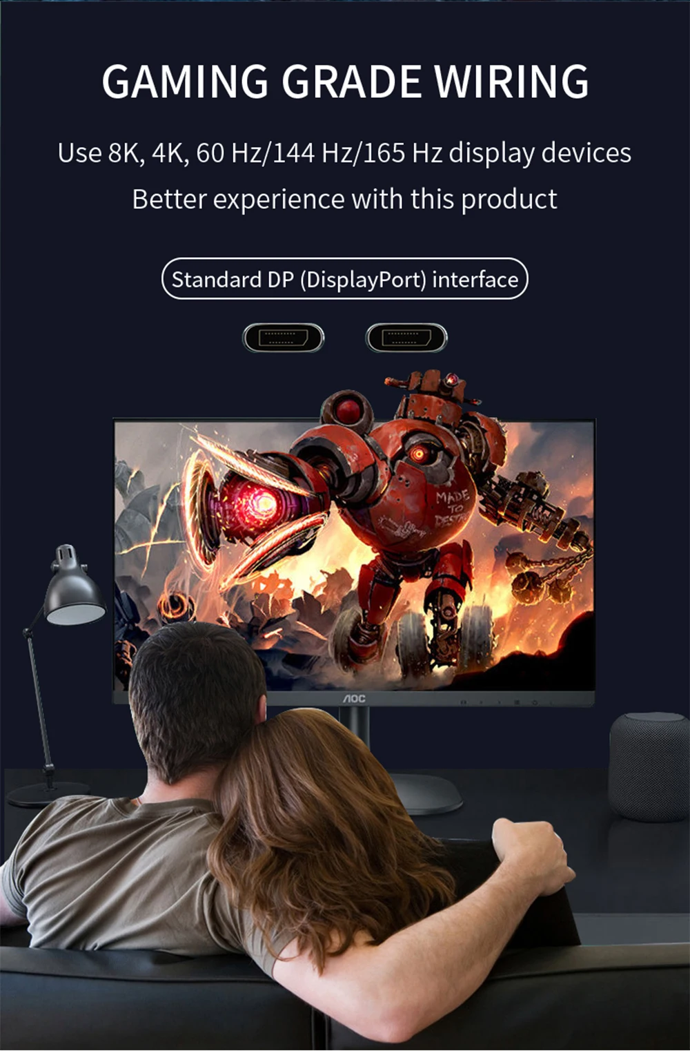 3. CABLEADO DE GRADO PARA JUEGOS Use dispositivos de visualización de 8K, 4K,60Hz/144Hz/165Hz Mejor experiencia con la interfaz DP (DisplayPort) estándar de este producto
