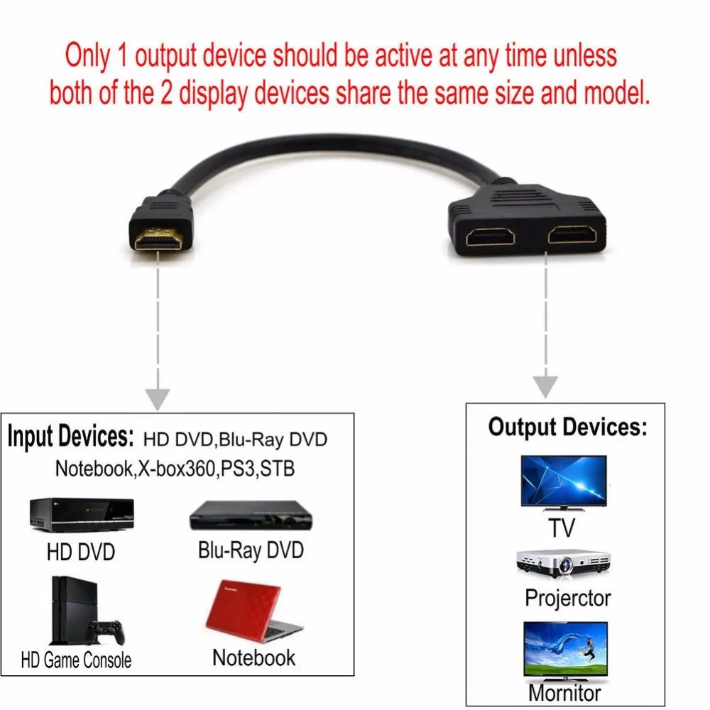 Este cable divisor es ideal para conectar dispositivos compatibles ( , Blueray, reproductores de DVD, PS3) a dos dispositivos de salida visual. Toma una señal de un dispositivo como un reproductor Bluray y se dirigirá a dos dispositivos de salida que están conectados a él.