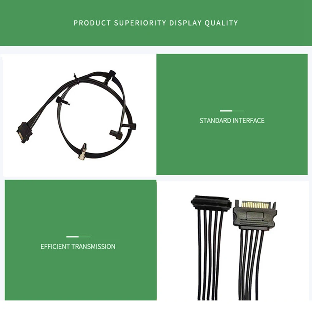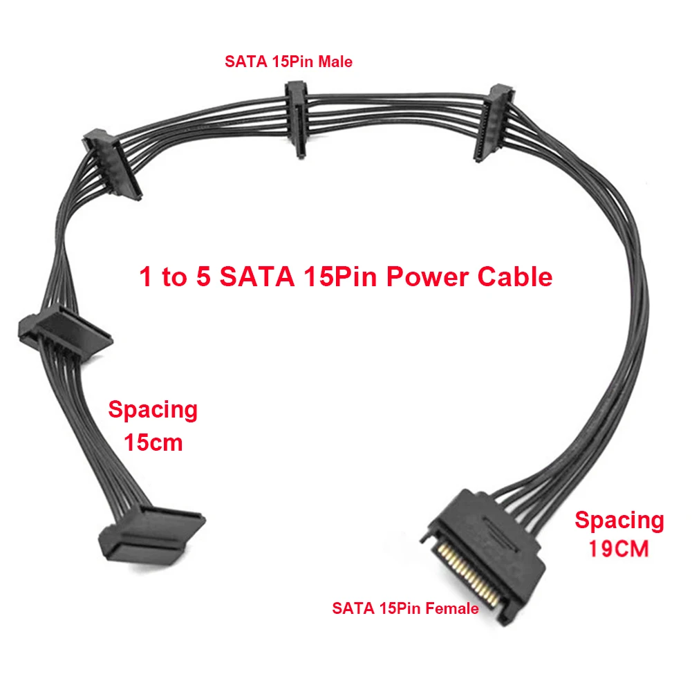 SATA 15Pin 1 a 5 SATA 15Pin F Disco duro Fuente de alimentación Cable divisor para DIY PC Sever Conector adaptador de corriente Especificación: Longitud del producto: 15cm + 15cm + 15cm + 15cm + 19cm (5,9 + 7,48 pulgadas) Modelo de cable: 18AWG negro Material del conductor: cobre estañado Interfaz del producto: SATA 15 pines macho y SATA 15 pines hembra