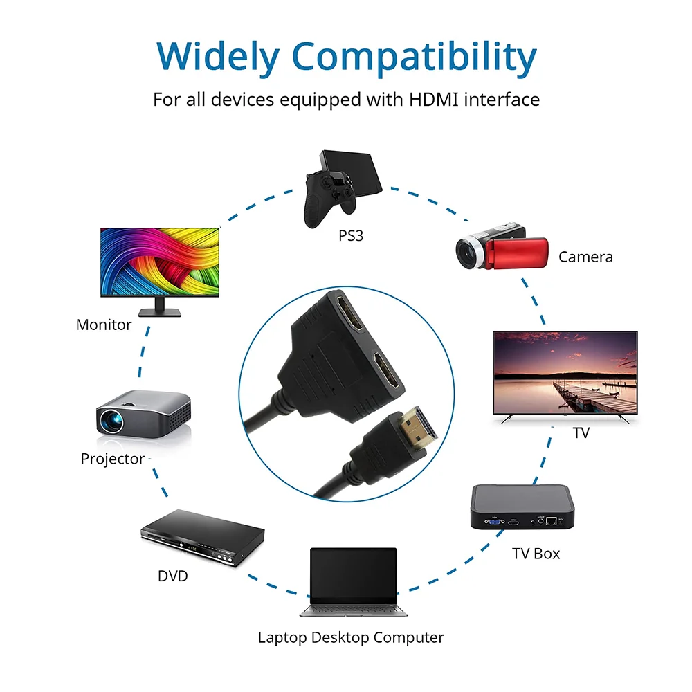 Este cable divisor HDMI es ideal para conectar un dispositivo compatible con HDMI (Xbox, Blue-ray, reproductores de DVD, PS3) a dos dispositivos de salida visual.Toma una señal de un dispositivo, como un reproductor de Blu-ray y se dirigirá a uno de los dos dispositivos de salida que estén conectados a él.
