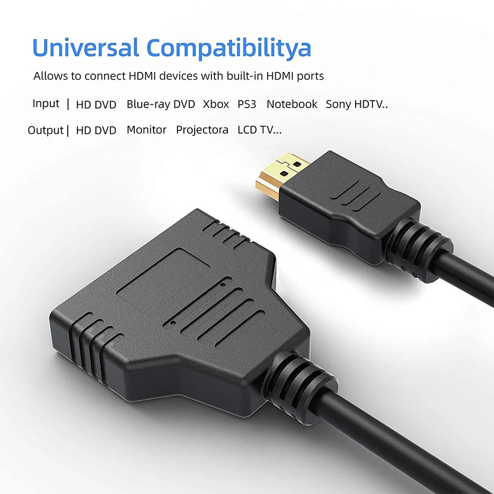 Este cable divisor HDMI es ideal para conectar un dispositivo compatible con HDMI (Xbox, Blue-ray, reproductores de DVD, PS3) a dos dispositivos de salida visual.Toma una señal de un dispositivo, como un reproductor de Blu-ray y se dirigirá a uno de los dos dispositivos de salida que estén conectados a él.