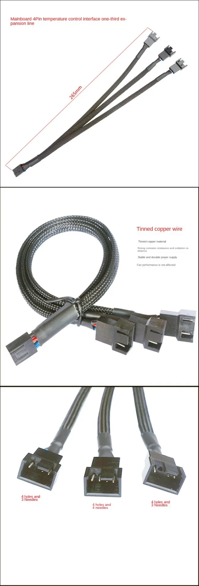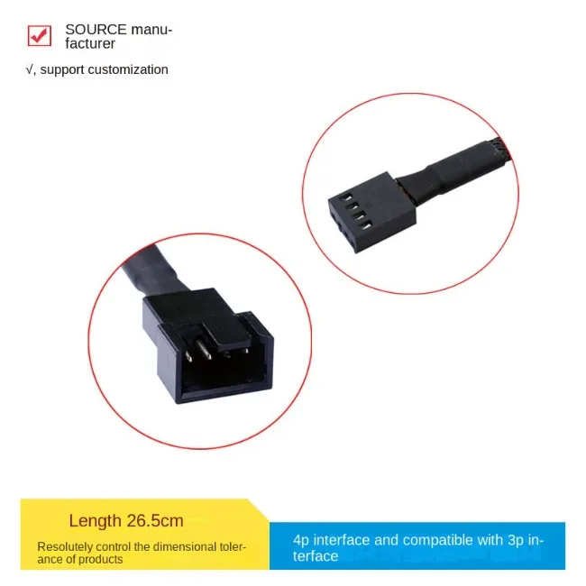 Especificación: Longitud: 27cm Modelo de cable: 1007 24AWG Material aislante: PVC Especificaciones del conductor: 11 * 0.12TS Material del conductor: cobre estañado Diámetro exterior del cable: OD1.4mm Temperatura nominal: 80 °C Color: negro Conector: 1 Conector de placa base de 4 pines, Conector de ventilador de 3x4 pines/3 pines (este conector universal podría usarse para 3 pines y 4 pines) Contenido del paquete 1x1/2/3/4 Way Cable de extensión PWM de 4 pines