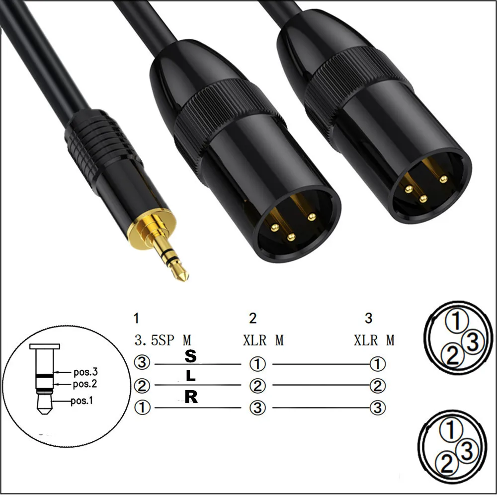 Una a dos hembra de 3,5 mm a dos XLR macho pueden emitir y dividir la señal estéreo AUX de 3,5 mm en dos cabezales macho XLR (izquierda/derecha) para ingresar la señal mono, o dividir los dos cabezales macho XLR en señal mono (izquierda/derecha) y fusionelos en una señal estéreo de 3,5 mm.El cable doble XLR macho a TRS hembra de 3,5 mm en forma de Y puede resolver el problema de los puertos XLR estrechos o lejanos para la distribución estéreo.Es una buena opción para conectar reproductores multimedia, computadoras portátiles o dispositivos similares a una consola de mezclas.El diseño escalonado de doble altura del conector para auriculares de 3,5 mm es muy conveniente para conectarse al puerto del micrófono de la cámara integrado, evitando eficazmente problemas de uso causados por que el conector no se inserta en el dispositivo debido a problemas de tamaño.