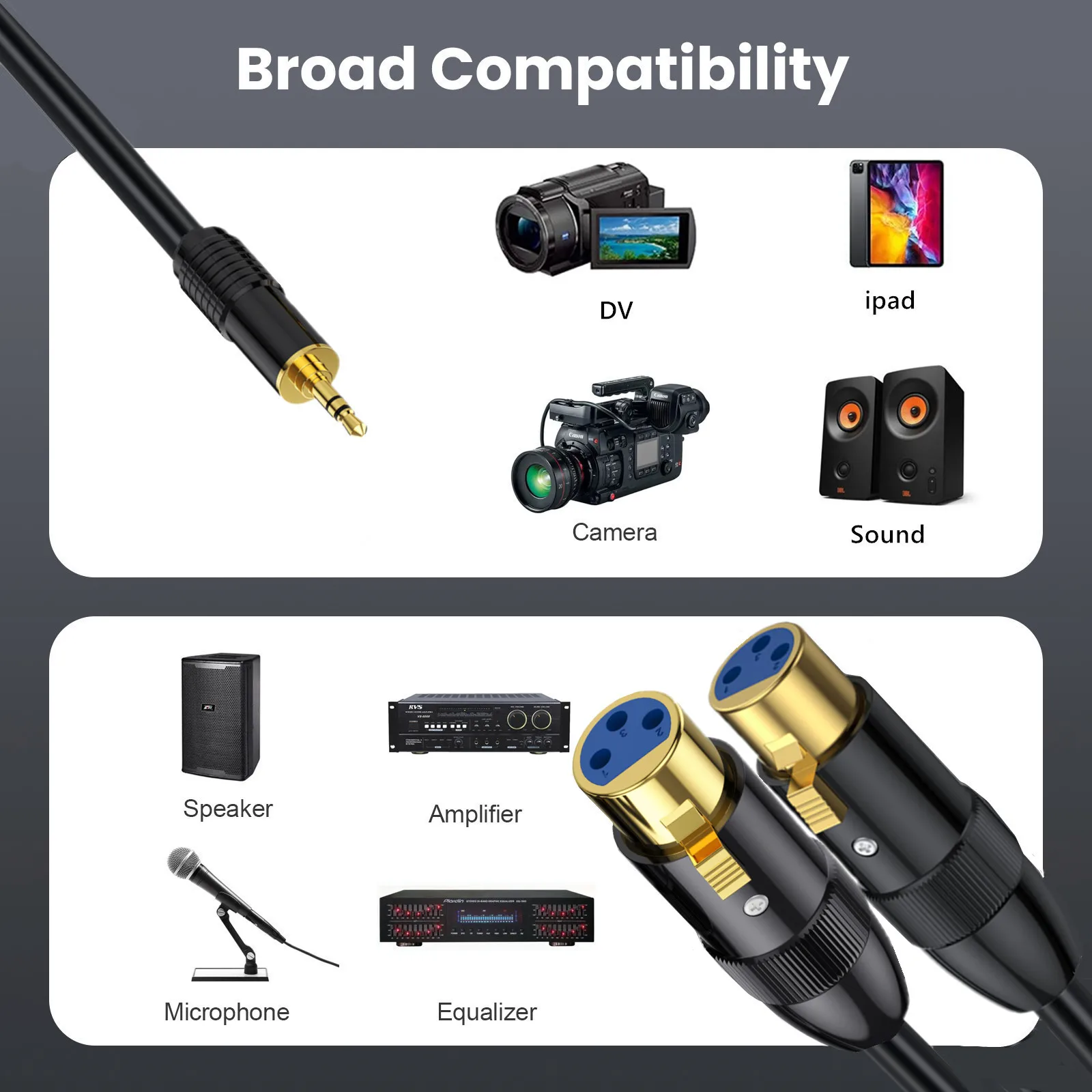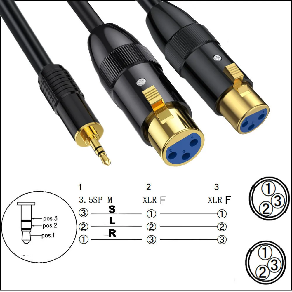 El cable hembra de 3,5 mm a doble XLR macho puede conectar dispositivos con un conector de 3,5 mm, como teléfonos inteligentes, iPods, reproductores de MP3, tabletas, computadoras portátiles o grabadoras, a una consola de mezclas o altavoces.