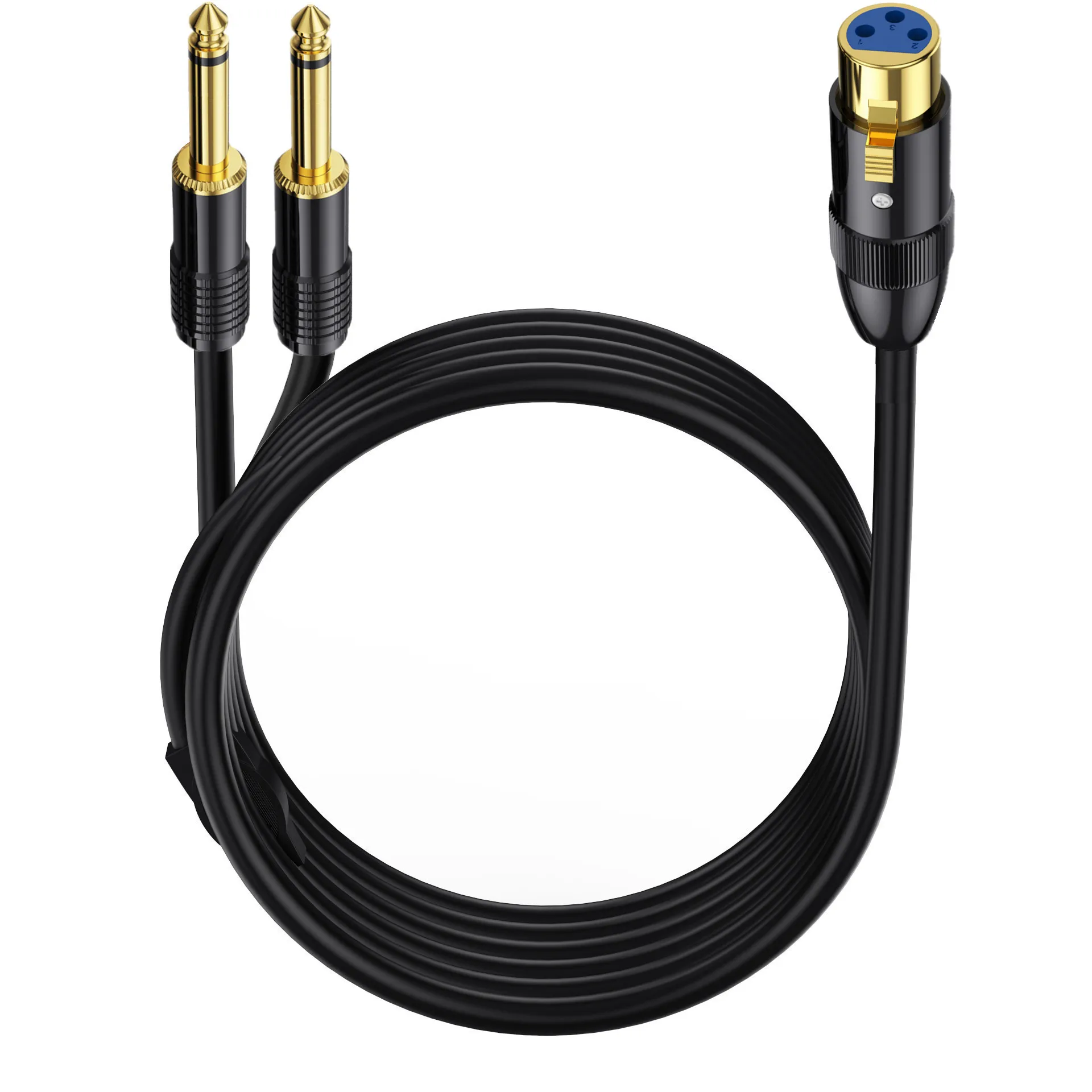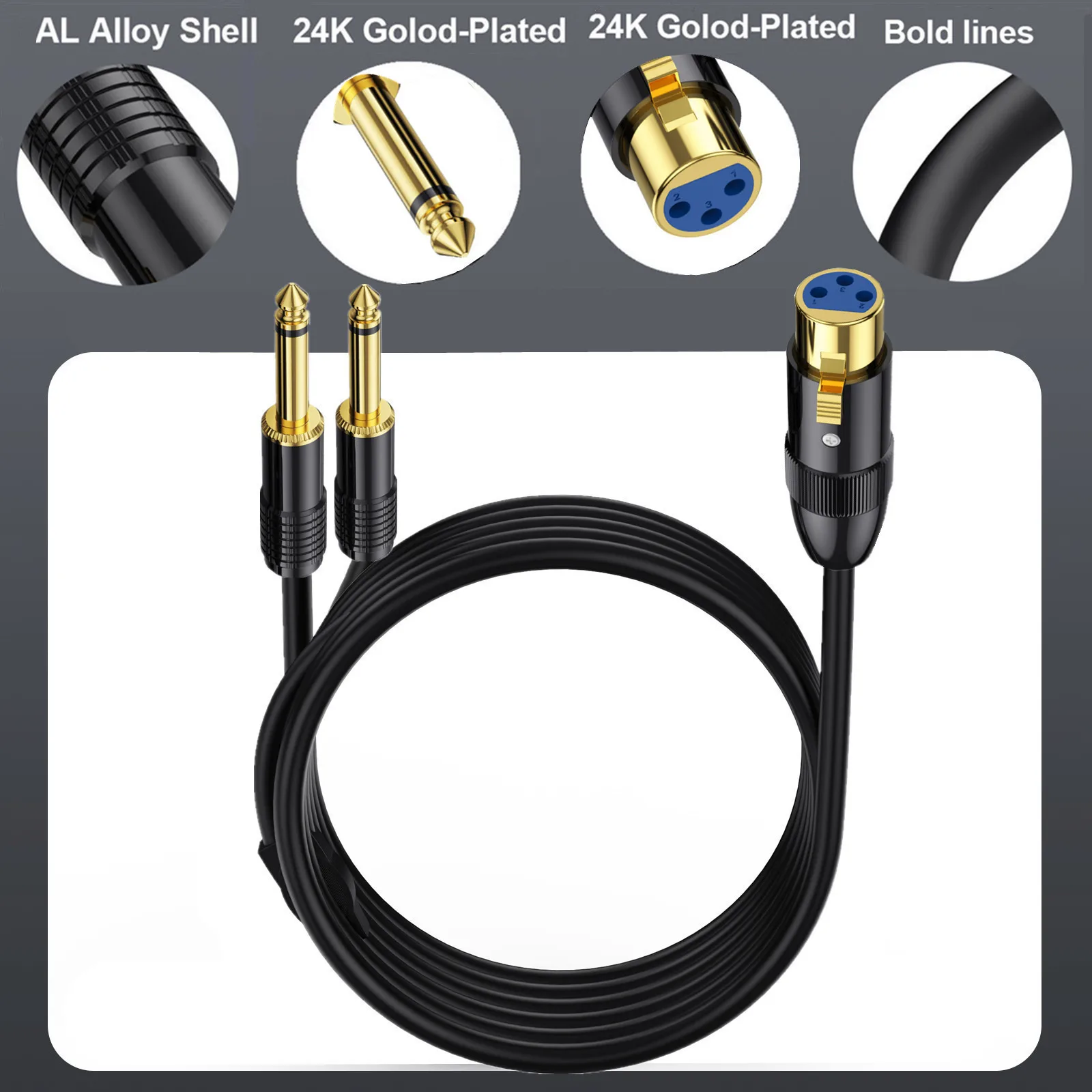 Conector hembra XLR de uno a dos a 2 cables de audio de enchufe mono macho TS de 6,35mm, XLR a 6,35mm conecta un micrófono con un conector de 1/4 pulgadas a una cámara DV, videocámara u otro equipo de audio profesional con un conector XLR. El adaptador XLR hembra emite canales izquierdo y derecho. El enchufe de 6,35mm chapado en oro se puede utilizar para los canales derecho e izquierdo respectivamente.