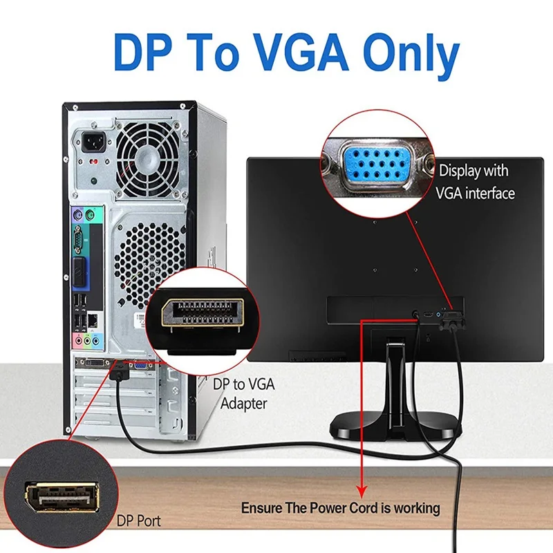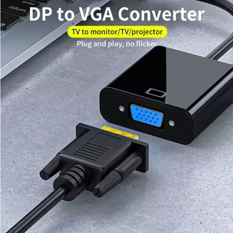 - El cable DP a VGA conecta una computadora de escritorio o portátil Displayort a un monitor o proyector con un puerto VGA.