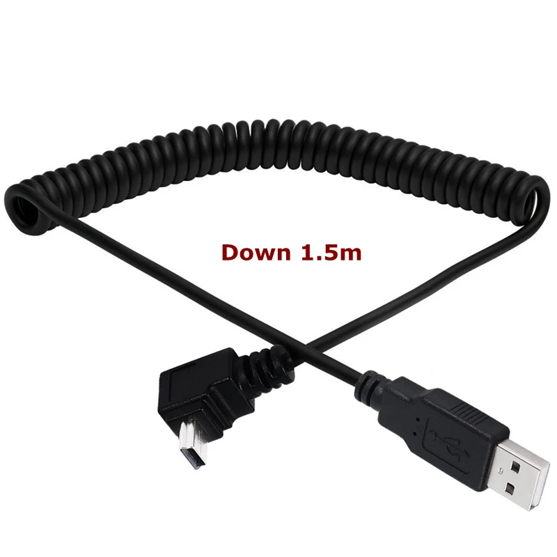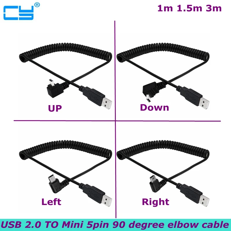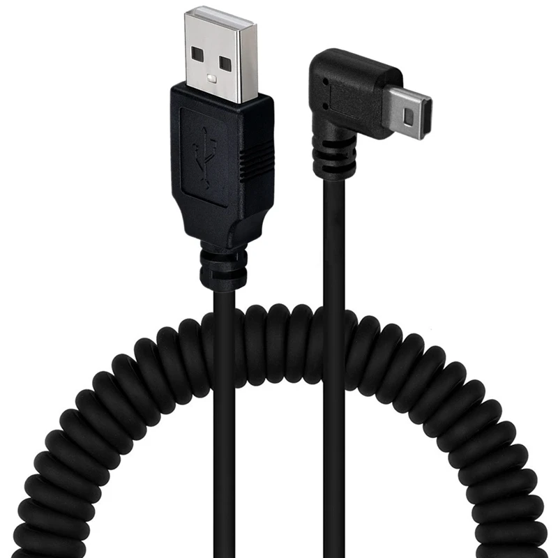 Cable elástico de resorte USB2.0 disco duro cámara digital cable de datos de teléfono móvil puerto en forma de T AM-Mini 5P doblado 90° arriba y abajo, izquierda y derecha, 1,5 metros;