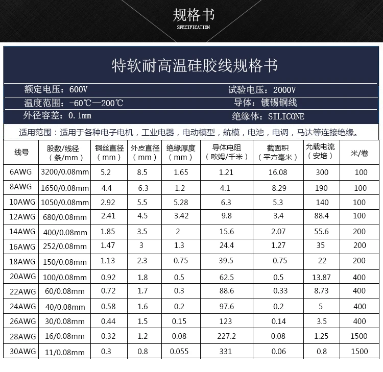 Núcleo interno de cobre estañado de alta calidad, puede mantener el cable de cobre durante mucho tiempo no se oxida. Piel exterior de silicona, suave resistente al desgaste, resistente a altas temperaturas, superficie lisa.