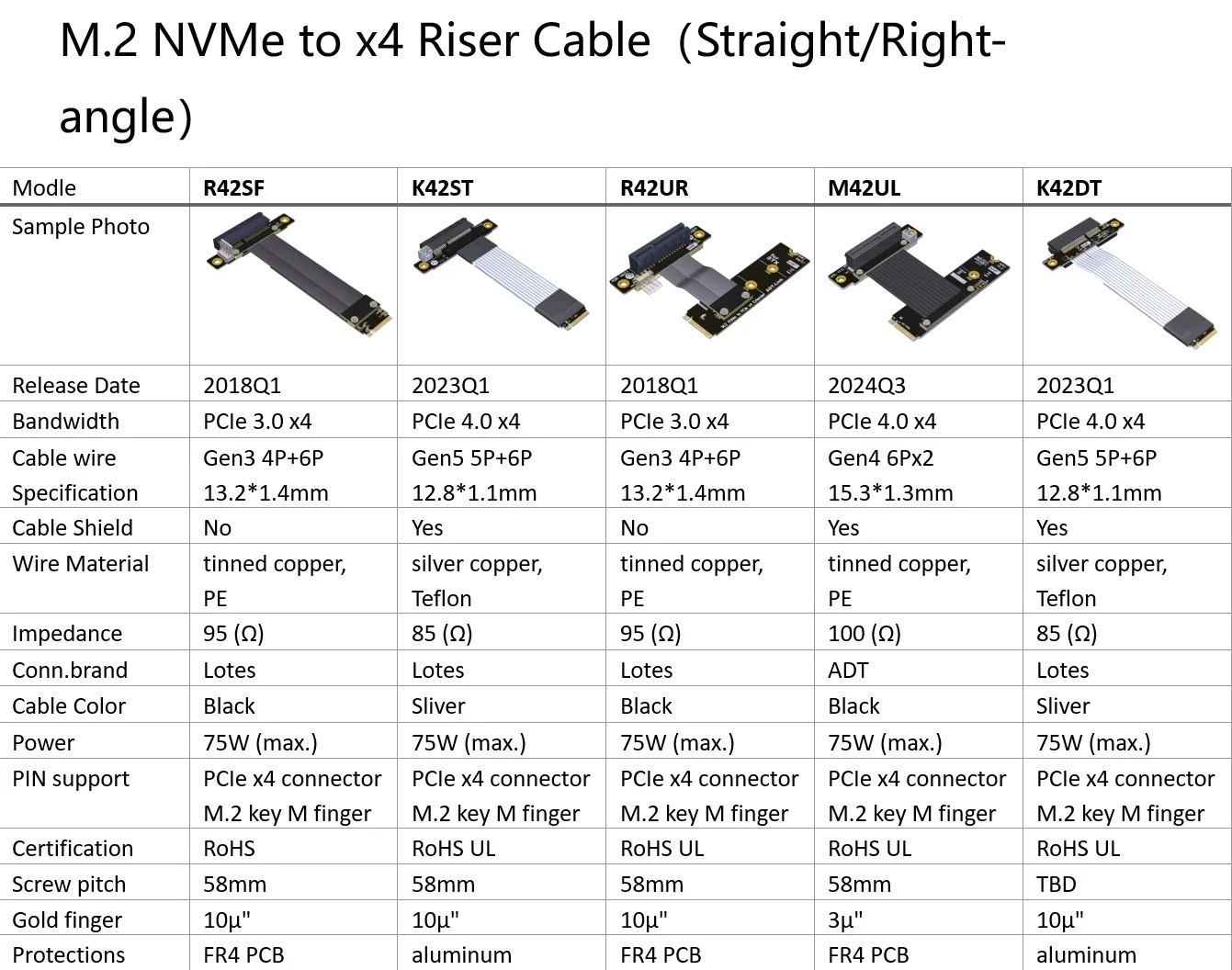 Número de piezaDescripciónAncho de banda (máx.)M42UFM.2 key-M NVMe a PCIe X4 turn Cables de extensión vertical de férula de 180 gradosPCIe 4,0x4 (64G/BPS)M42ULTecla M.2-M NVMe a PCIe X4 Cables de extensión de 90 gradosPCIe 4,0x4 (64G/BPS)M42ULTecla M.2-M NVMe a PCIe X4 Cables de extensión de giro de 270 gradosPCIe 4,0x4 (64G/BPS)M42: M.2 NVMe a X4