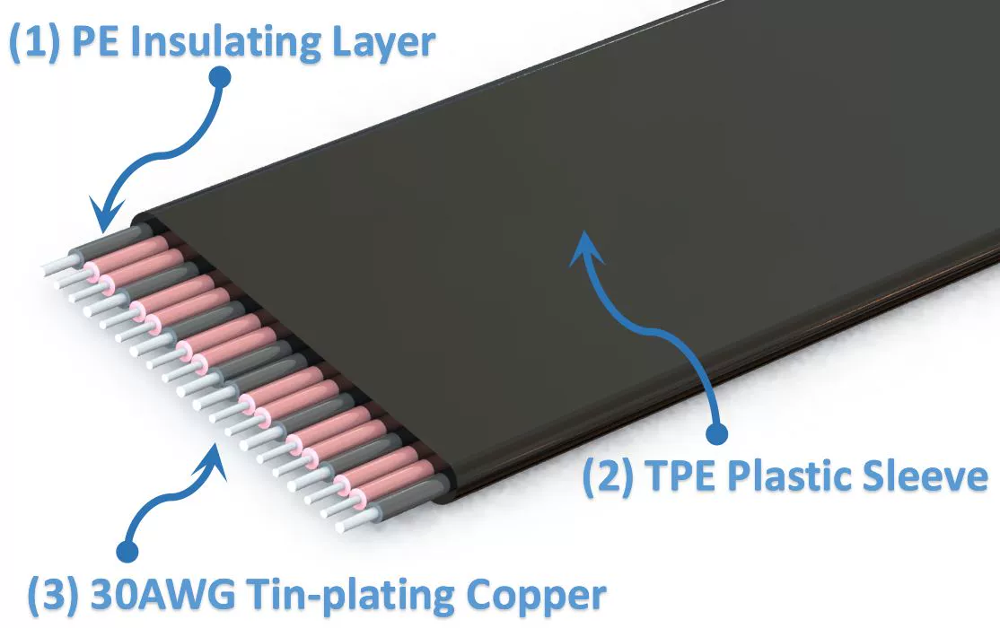 El extensor utiliza los materiales más novedosos para el blindaje EMI con cinco diseños de cables planos. Esta técnica permite que cada cable esté completamente cubierto por blindaje de interferencia electromagnética con polímero conductor para proteger contra las emisiones entrantes o salientes de frecuencias electromagnéticas, minimizar las perturbaciones y la degradación del rendimiento, y reduce el peso del extensor.