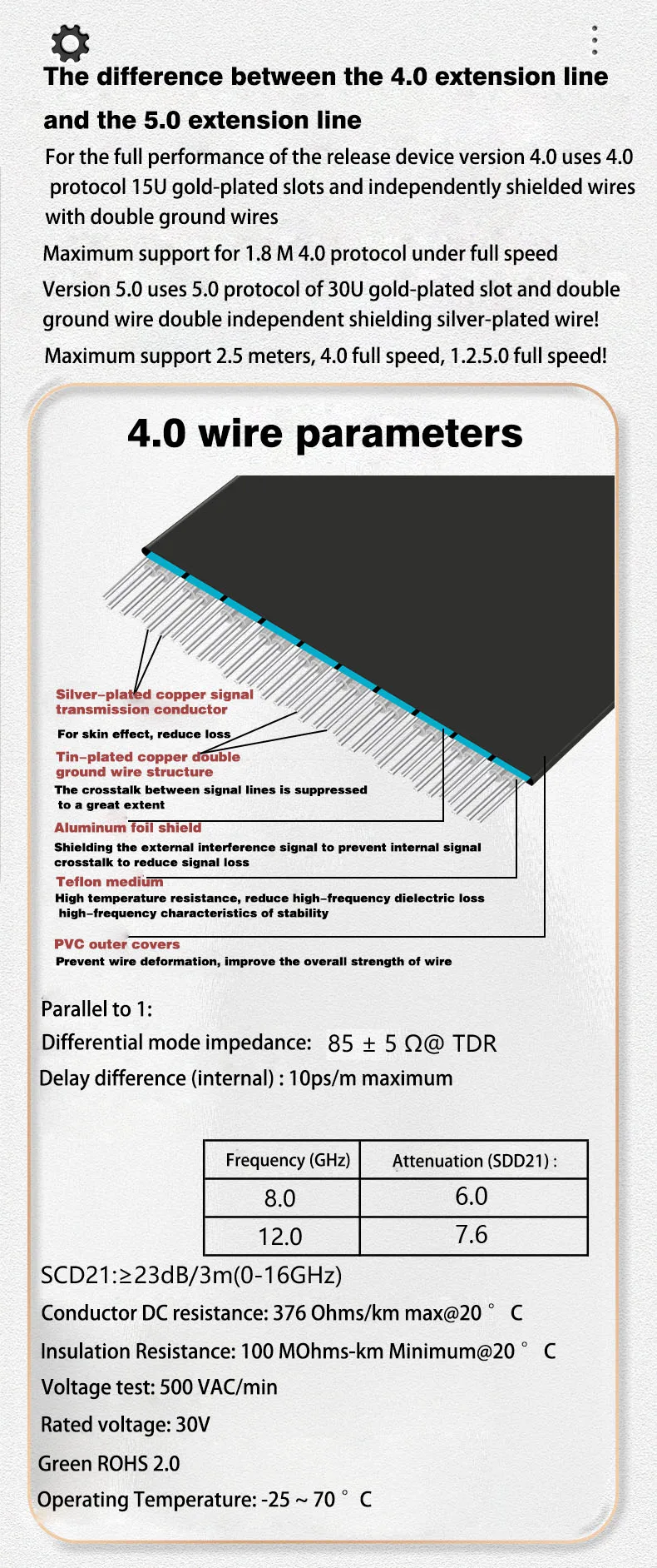 - 3. TOTALMENTE FLEXIBLE: La nueva construcción con bandas de cinco hilos permite una flexibilidad total para alcanzar incluso los huecos más estrechos. Después de numerosas mejoras de diseño, el diseño de cinco cables GEN 4,0 es mucho mejor que los otros diseños en términos de transmisión, blindaje y atenuación. El blindaje individual único evita EMI/RFI externo y la interferencia entre canales.