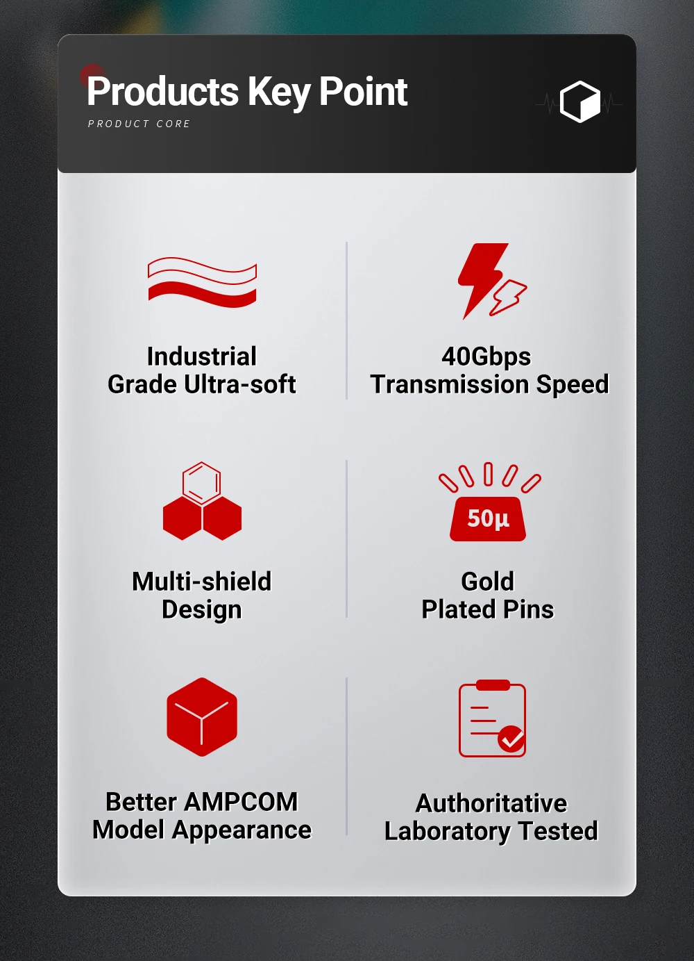 Ultra suave de grado industrial/velocidad de transmisión de 40 Gbps/desigh multiescudo/pines chapados en oro/mejor apariencia del modelo AMPCOM/probado en laboratorio autorizado