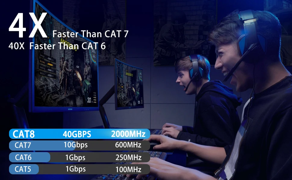 Los cables Cat 8 pueden lograr un mayor rendimiento que cat7, Cat6 o CAT5e tradicional, CAT5, admiten ancho de banda de hasta 2000MHz y velocidad de hasta 40Gbps, mejoran su experiencia de juego en línea.