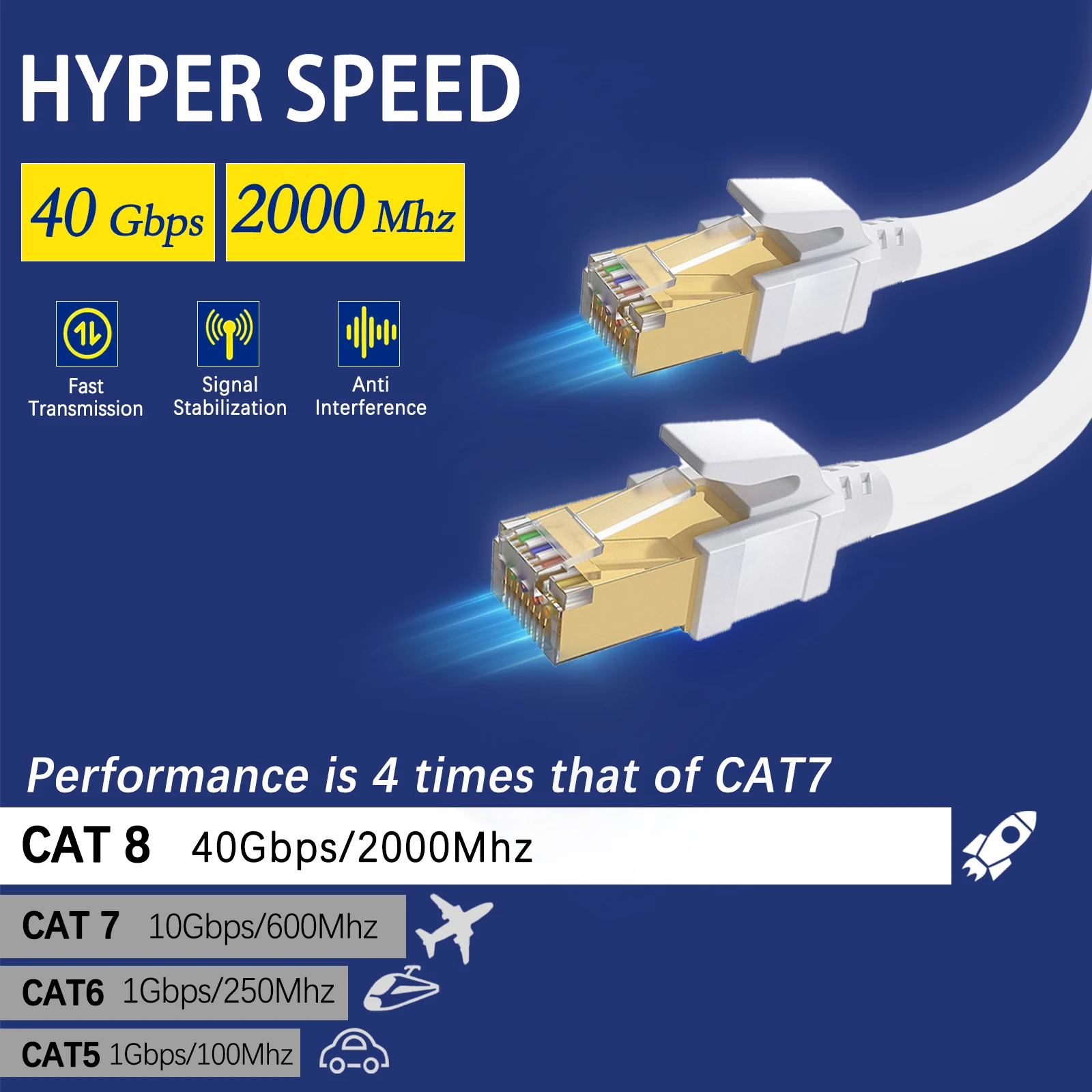 Los cables Cat 8 pueden lograr un mayor rendimiento que cat7, Cat6 o CAT5e tradicional, CAT5, admiten ancho de banda de hasta 2000MHz y velocidad de hasta 40Gbps, mejoran su experiencia de juego en línea.