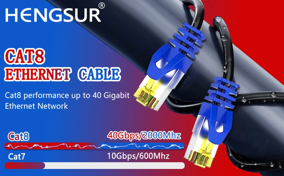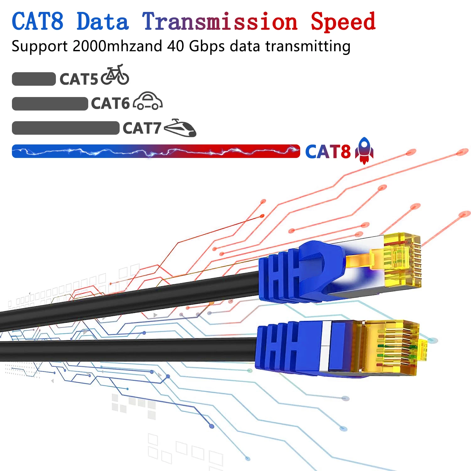 El cable de conexión Cat8 RJ45 trenzado es más rápido que Cat7/Cat6a/Cat6/Cat5e/Cat5.El cable Cat 8 es una categoría 8 compatible con 40 Gigabit Ethernet "40 GBASE-T" de próxima generación que es ideal para comunicación 5G de alta velocidad, que admite transferencia de datos de alta velocidad de hasta 2000 MHz para aplicaciones de servidor, almacenamiento en la nube, video chat., transmisión de vídeo de alta definición y juegos.Así, es el mejor cable para jugar, trabajar y entretenerse.