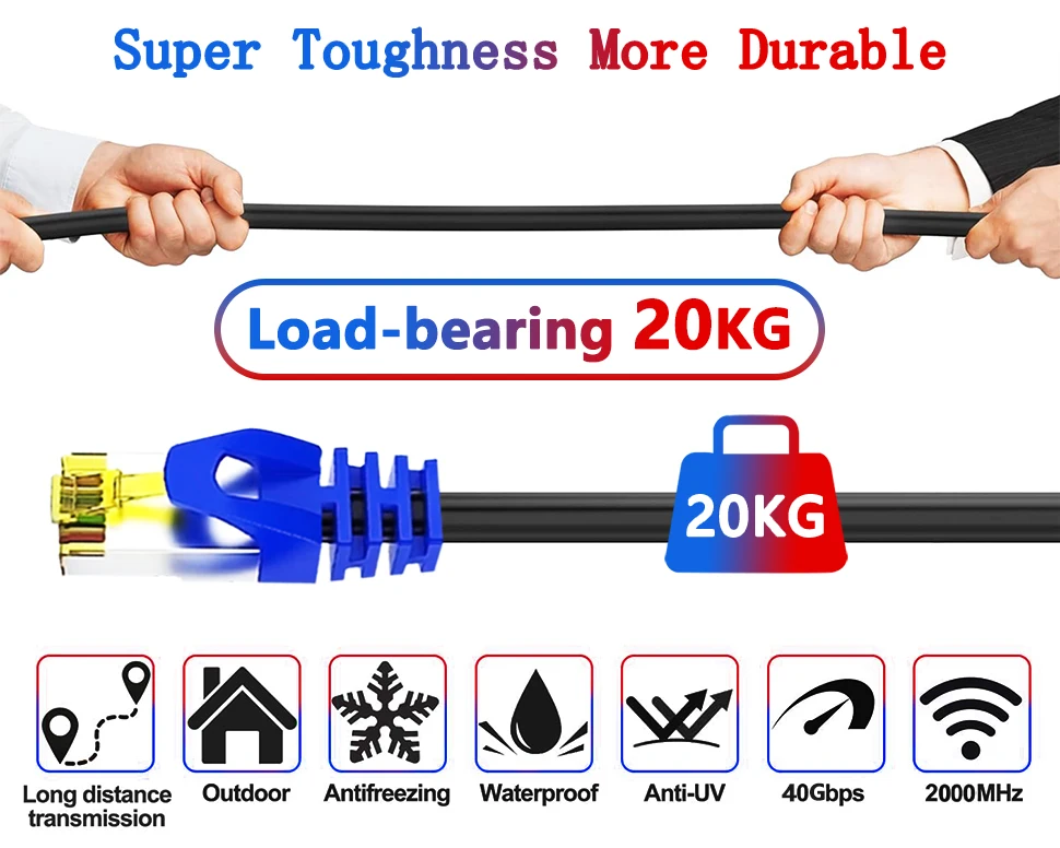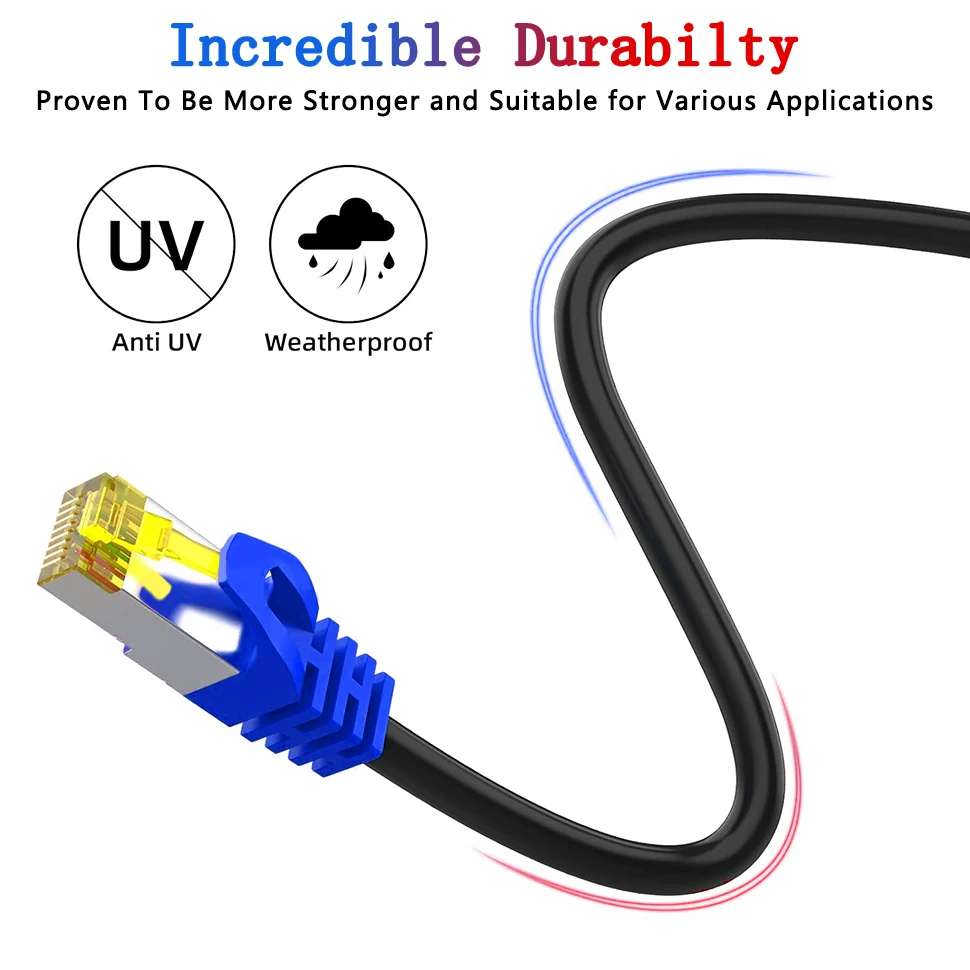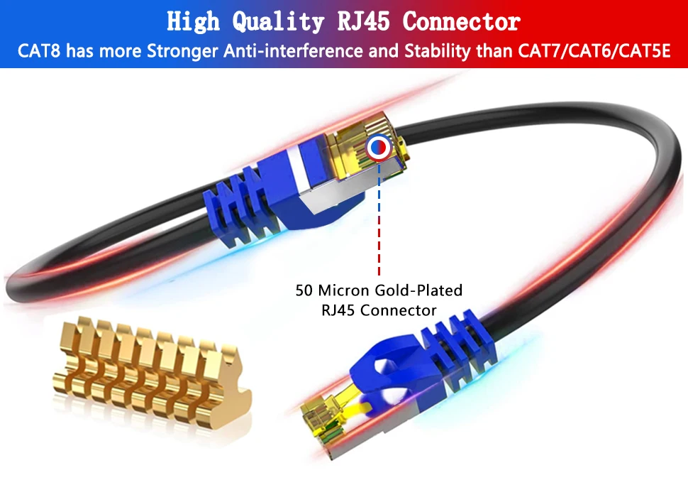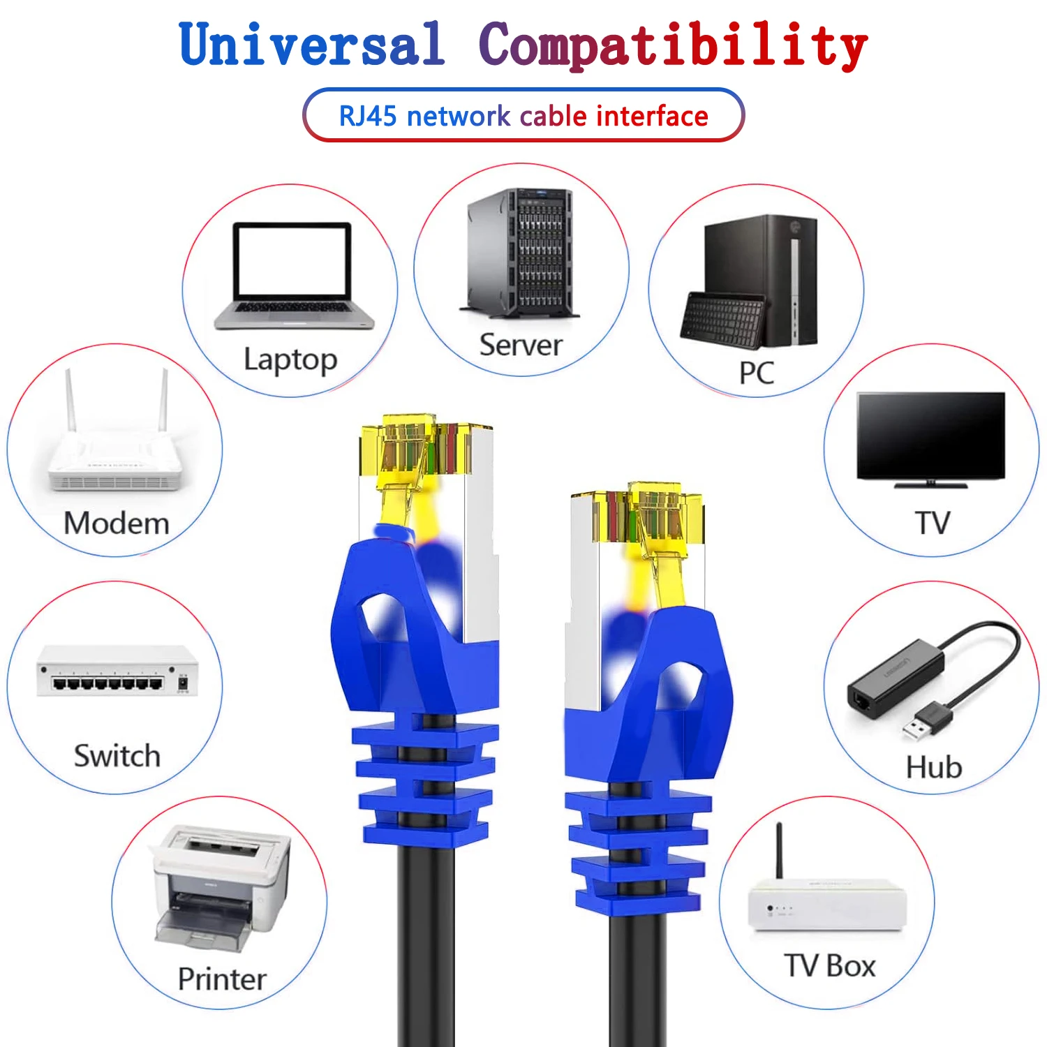 El cable Ethernet Cat 8 de alta velocidad construido con el conector RJ45 lo hace perfecto para servidores, TV, TV Box, computadora portátil, PC, impresora, conmutador de red, enrutadores, ADSL, adaptadores, concentradores, módems, PS3, PS4, PS5, X-box, paneles de conexión y otras aplicaciones de red de alto rendimiento.