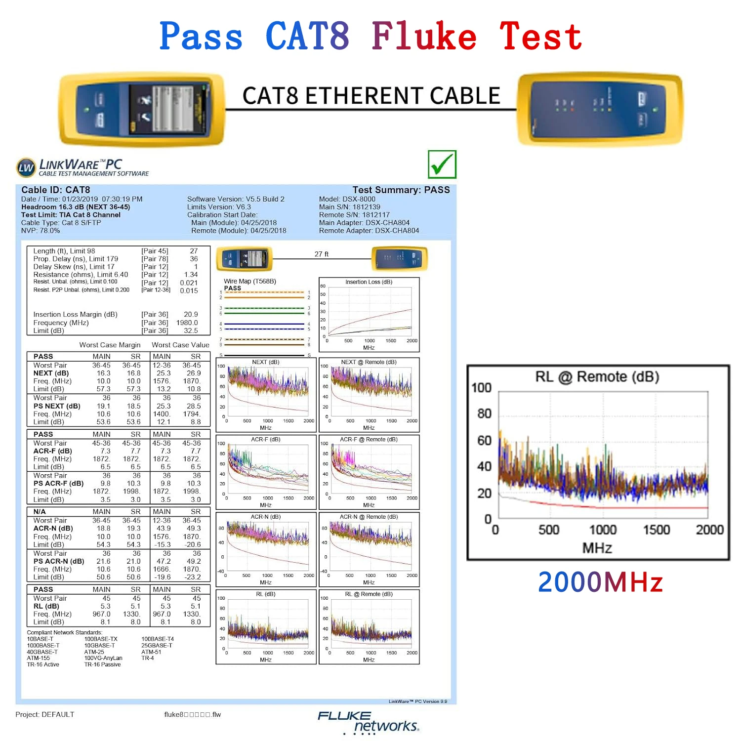 Probados con analizadores de cables profesionales Fluke y todos nuestros cables Cat8 están certificados individualmente según estrictos estándares industriales (TIA 10G Patch Cord o Channel).La certificación incluye crucigramas de extremo cercano, pérdida de retorno, retraso de prorogación, retraso de inclinación, etc.