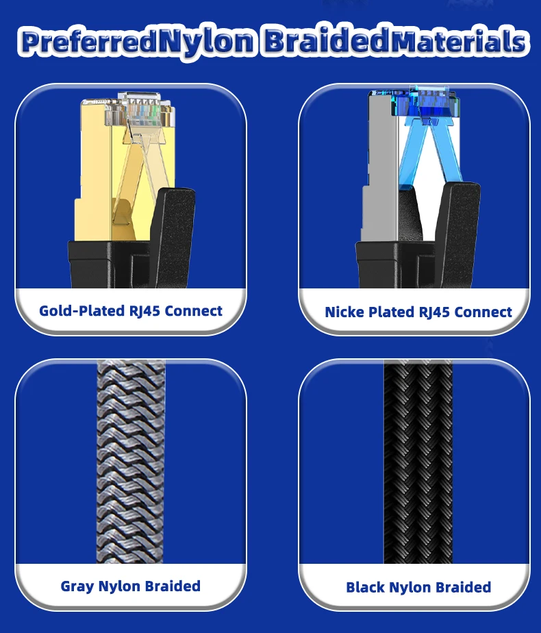 Los conectores chapados en oro de 24 quilates y los contactos chapados en oro de 8P8C brindan velocidades más rápidas y estables, y la experiencia del cable Cat8 será más placentera.