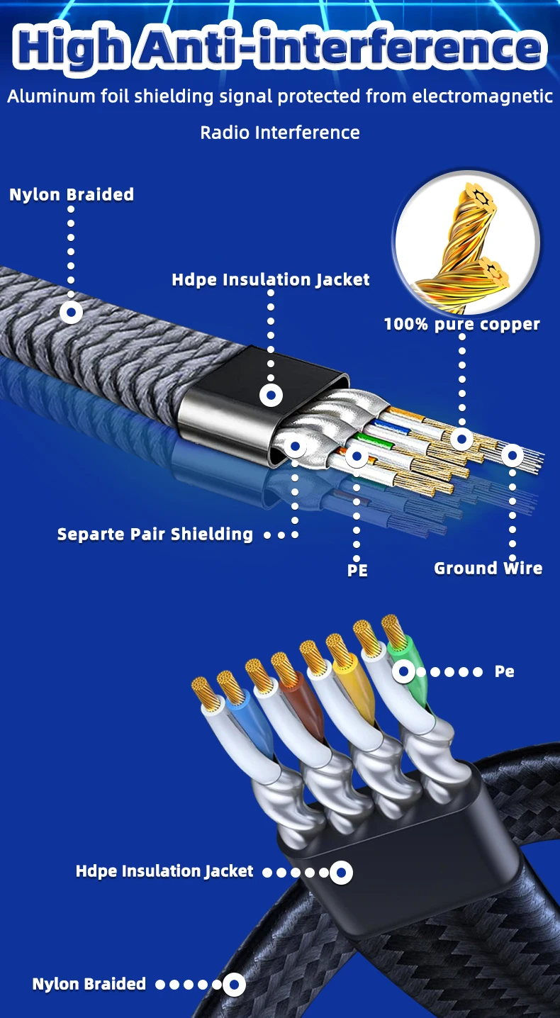 Los cables de red trenzados de nailon Cat 8 están hechos de 4 pares trenzados blindados de alambres de cobre (SSTP) para resistir interferencias exteriores, fabricados con conectores RJ45 chapados en oro para brindar durabilidad y una conexión segura, y cable cubierto por una cubierta de fibra de nailon trenzada doble para mantener elegante y duradero.Esto aumentará la confiabilidad y precisión de la transferencia de datos.
