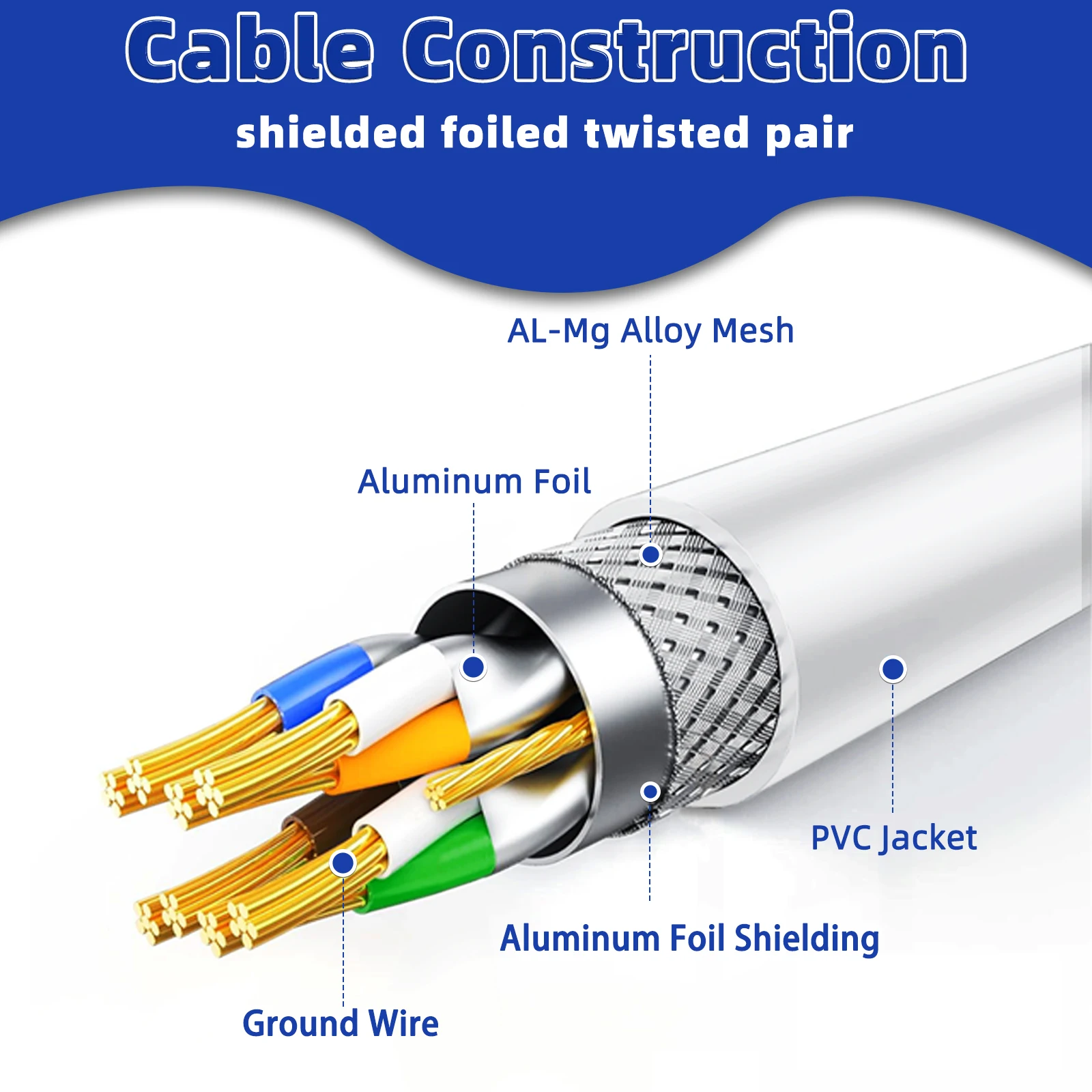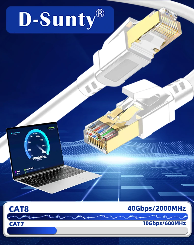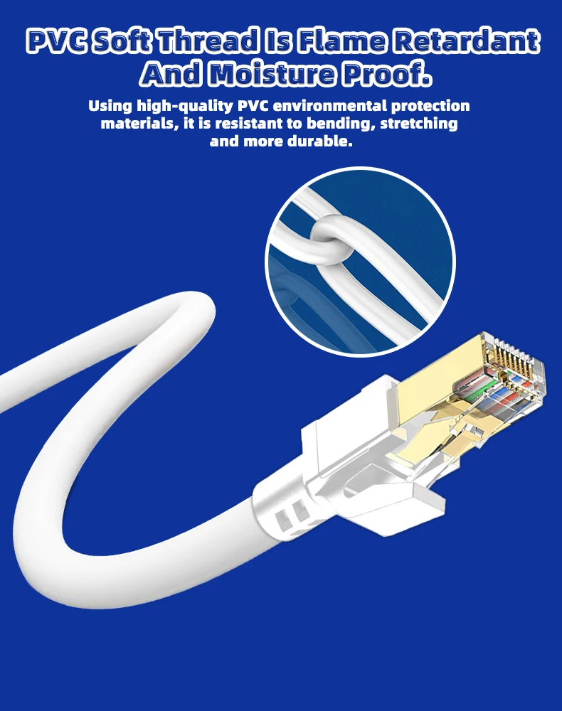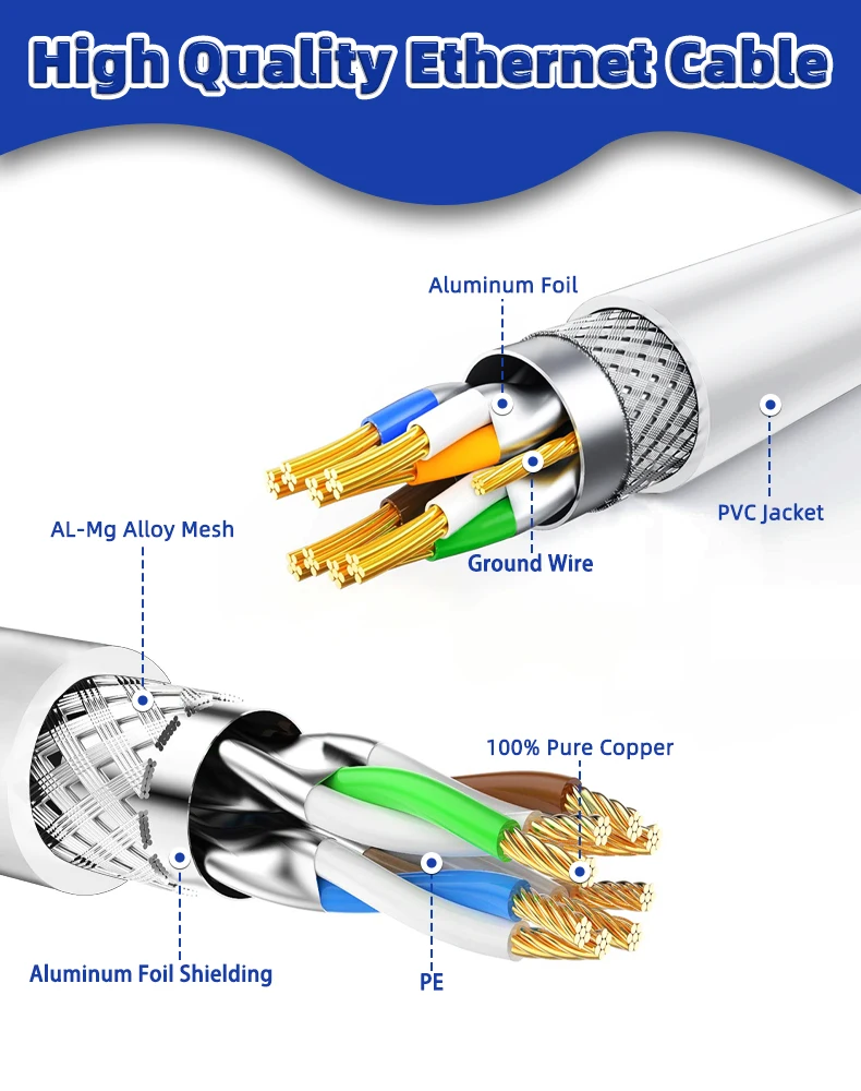 Nuestro cable de conexión Cat8 está fabricado con 4 pares trenzados laminados blindados (S/FTP) y cables OFC de un solo hilo.Esta construcción avanzada admite un impresionante ancho de banda de hasta 2000 MHz, lo que permite velocidades de transmisión de datos de hasta 40 Gbps.El diseño de doble escudo proporciona una protección excepcional contra diafonía, ruido de fondo e interferencias de degradación de señal.Con este cable Cat8 blindado, puedes transmitir vídeos y música en HD, navegar por la web y jugar a velocidades de breakneck, todo sin problemas.