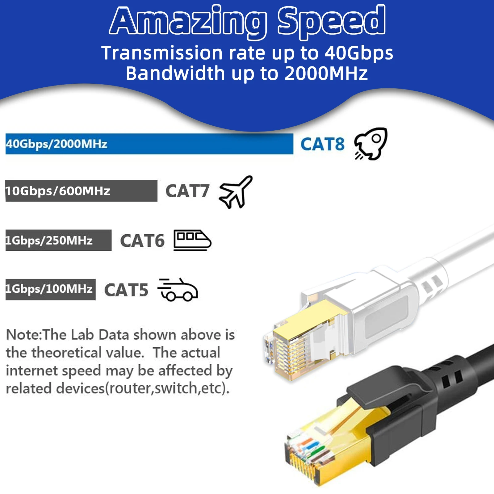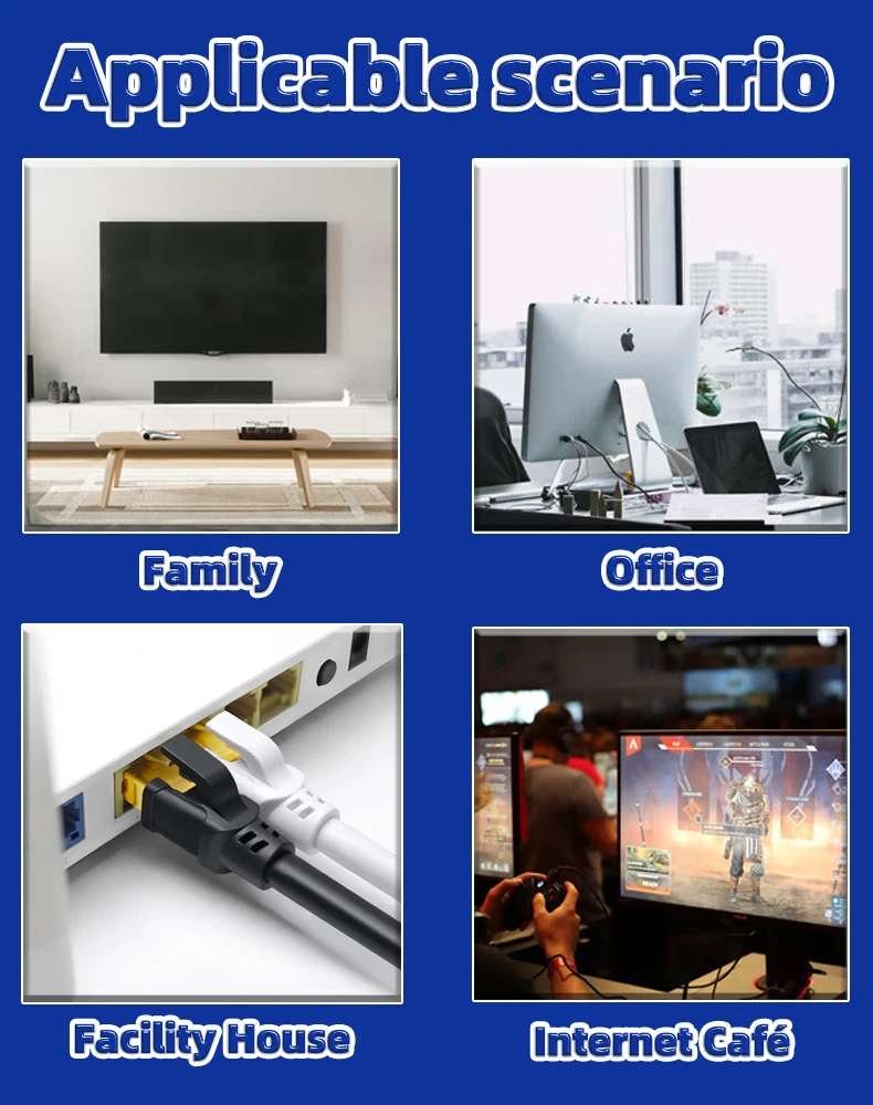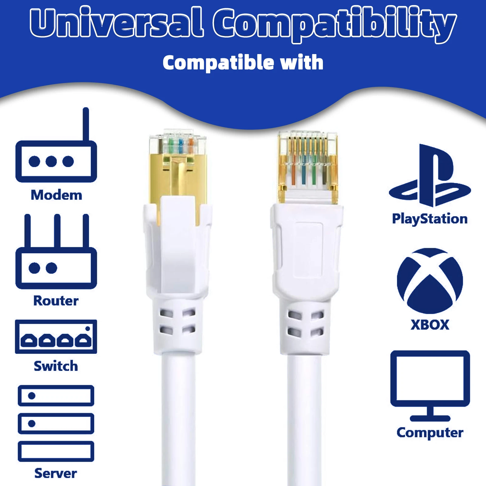 Con dos conectores RJ45 blindados en ambos extremos, nuestro cable Ethernet Cat8 es totalmente compatible con los estándares de cables CAT7, CAT6 y CAT5.Funciona perfectamente con una amplia gama de dispositivos, incluidas cámaras IP, enrutadores, Nintendo Switch, módems ADSL, adaptadores de red, PS3, PS4, X - box, paneles de conexión, servidores, impresoras de red, dispositivos Netgear, unidades NAS, teléfonos VoIP, computadoras portátiles, acopladores, concentradores, conectores Keystone, televisores inteligentes y iMacs.No importa cuál sea su configuración de red, este cable lo tiene cubierto.