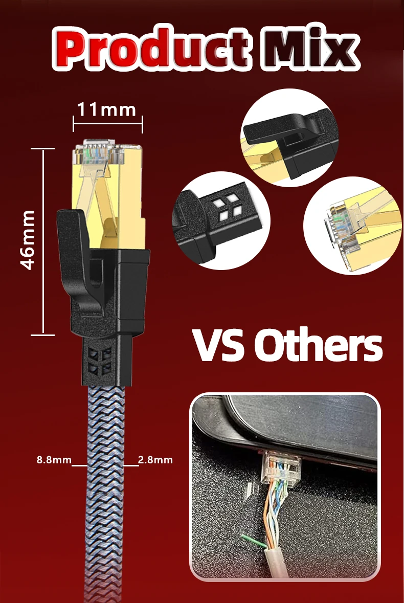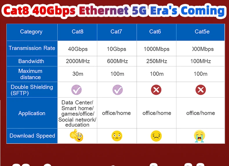 El cable Ethernet admite frecuencias de hasta 2 GHz (2000 MHz) y velocidades de transferencia de datos de hasta 40 Gbps a distancias de hasta 30 metros.Este aumento sustancial en las posiciones de ancho de banda y velocidad de transferencia de datos Los cables Cat8 son una opción superior para entornos que requieren conexiones confiables y de alta velocidad.Si bien Cat8 ofrece un rendimiento mejorado, su distancia máxima efectiva es de 30 metros, lo que puede limitar su uso en ciertos escenarios.