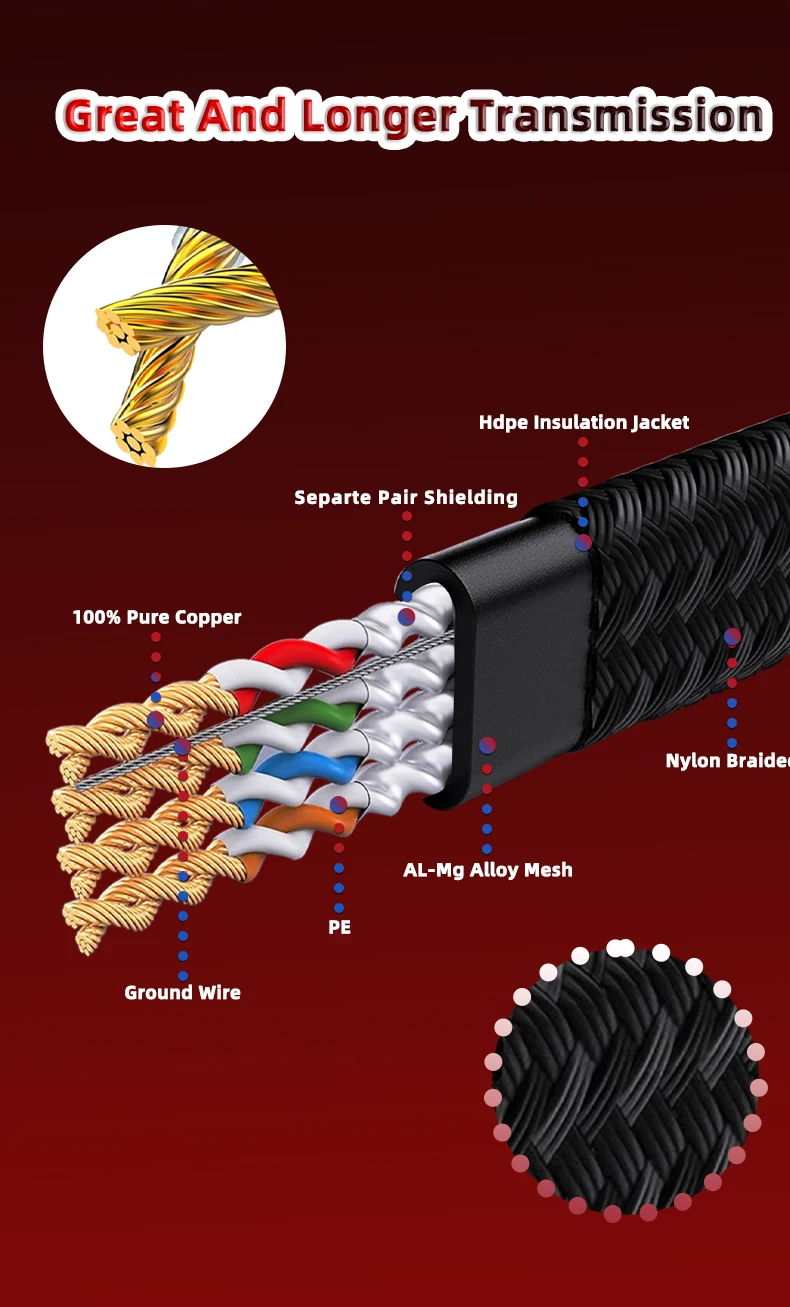 El diseño exterior trenzado de nailon mejora la resistencia al desgaste, extendiendo la vida útil y la adaptabilidad del cable a diversos escenarios de uso.Internamente, cuenta con un núcleo de cobre 100% libre de oxígeno, con cada par de cables trenzados blindados individualmente.Combinada con una cubierta aislante de HDPE ecológica, esta construcción garantiza una transmisión de señal eficiente y estable al mismo tiempo que contribuye a la sostenibilidad ambiental.