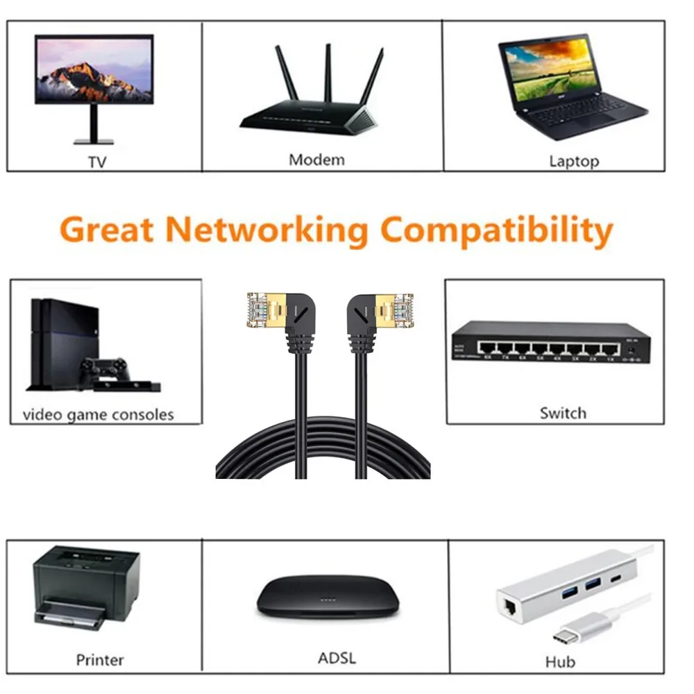 Los 90° El diseño de codo resuelve el problema del cableado en un espacio estrecho, utilizando conexiones de codo en las esquinas/TV/parte posterior del chasis, etc., y utilizando el espacio estrecho hábilmente para resolver el problema de que el cable de red no es fácil de enchufar.