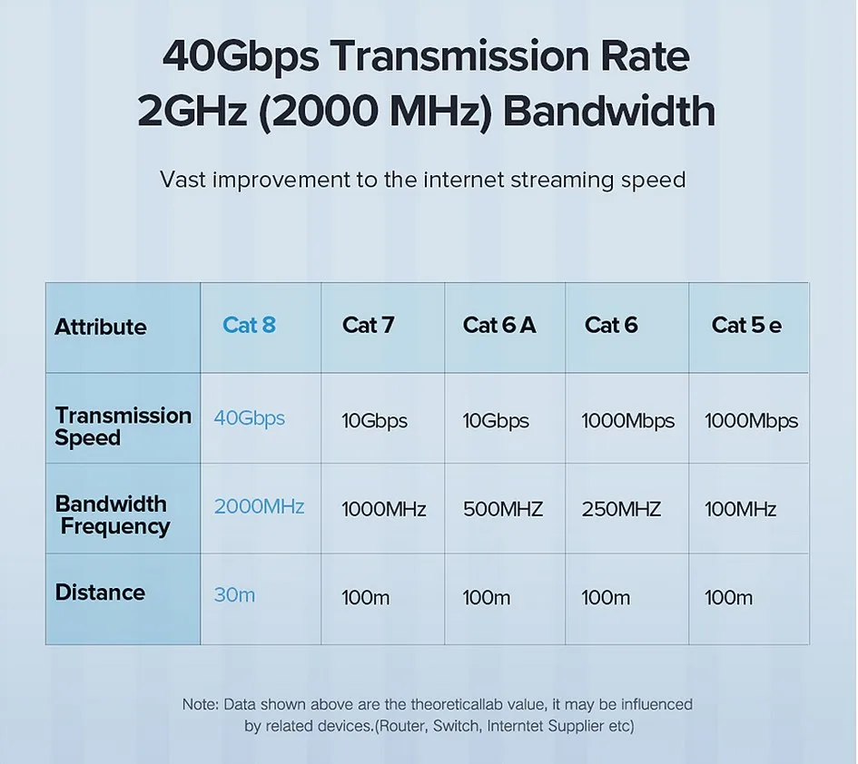 4) estable y duradero-en comparación con otros cables 32AWG, este cable Ethernet 28AWG Cat8 es más grueso y más fuerte que CAT7, CAT6. El material de la carcasa de PVC envuelve el cable de núcleo de cobre libre de oxígeno, asegura una transmisión remota de baja resistencia.