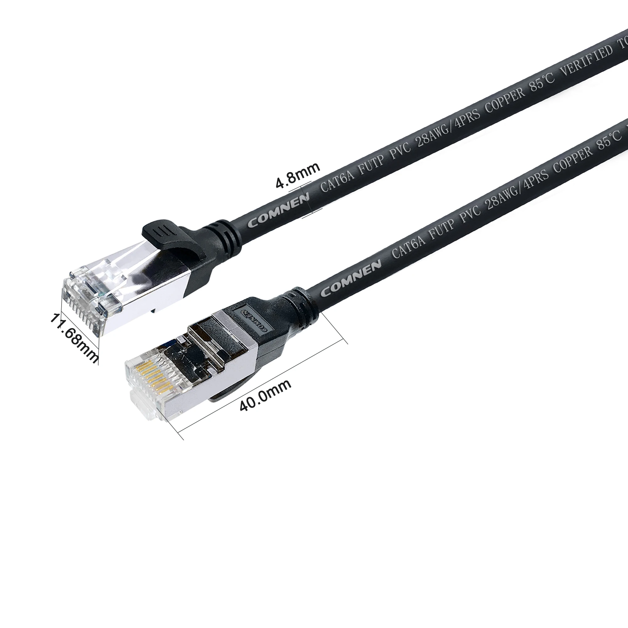 El Cable de conexión Cat6a F/UTP RJ45 de COMNEN presenta un alto rendimiento y OD Delgado: 4,8mm, velocidad de transmisión de datos de hasta 10Gbps a frecuencia de 500MHz, es una solución para actualizar su Ethernet; la chaqueta de PVC modificado extremadamente flexible permite temperaturas de trabajo de-40 a + 85 grados. Consta de un conector macho RJ45 8p8c blindado en cada extremo y 4 pares trenzados de cables de cobre desnudo de 28AWG(7/0.12mm). Normalmente se utiliza para conexiones de red 10 Gigabit Ethernet o retroactivas, como paneles de conexión, conmutadores, ordenadores y enrutadores. Todos los cables se prueban 100% antes de embalarlos.