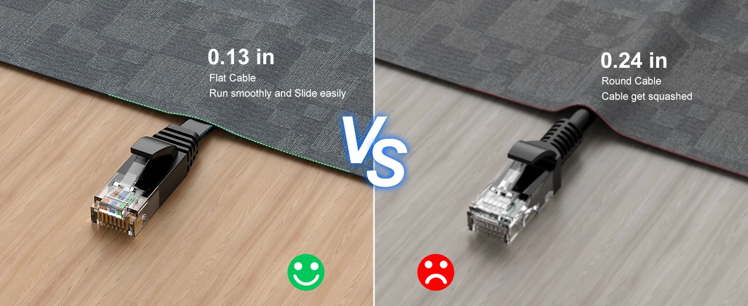 El diseño de cable plano, con un grosor de solo 1,5 mm, ayuda a evitar enredos y ahorra espacio.Los cables planos Ethernet Cat6 son lo suficientemente flexibles cuando se coloca debajo de la alfombra, detrás de muebles o se dobla en el plano de su delgada sección transversal, como puertas, brazos giratorios, cajones, etc., mejorando el aspecto del cableado de su hogar u oficina.