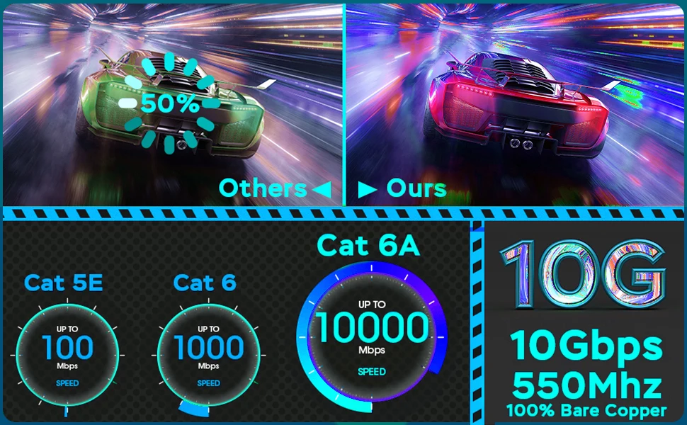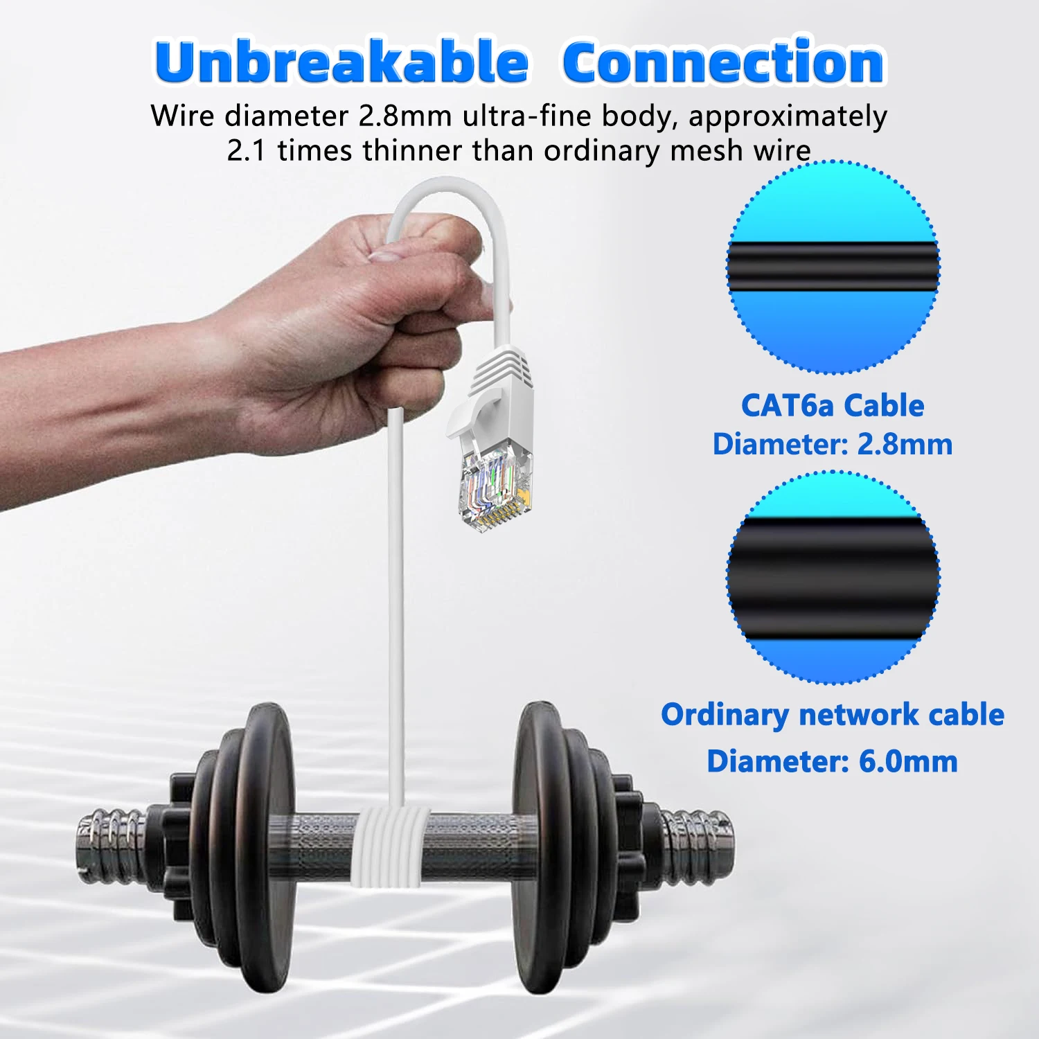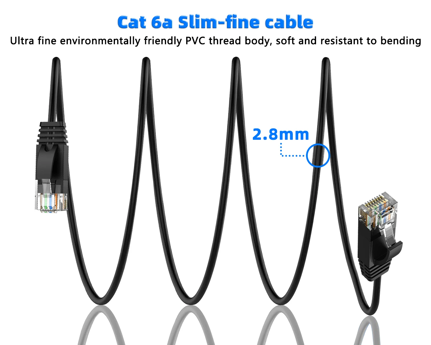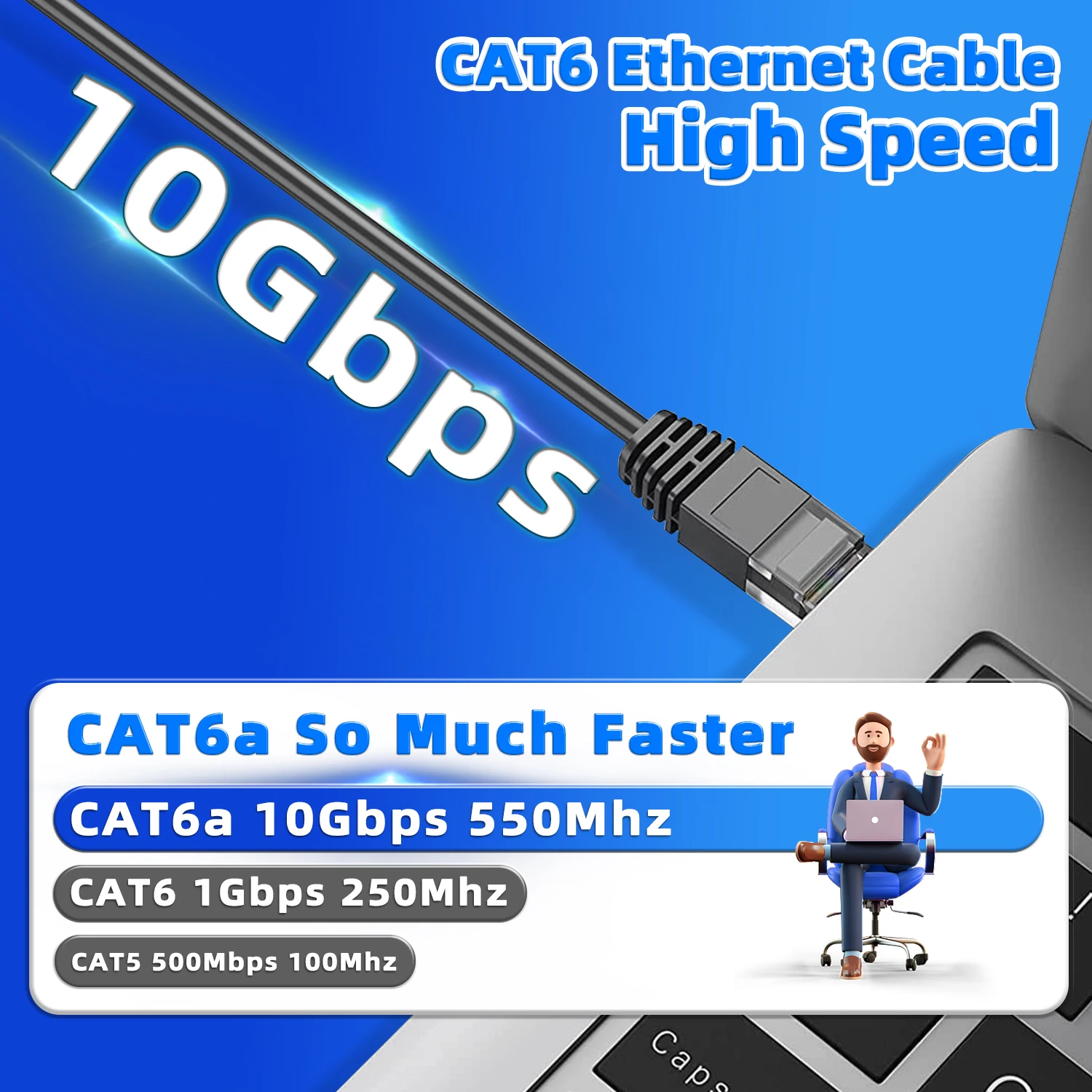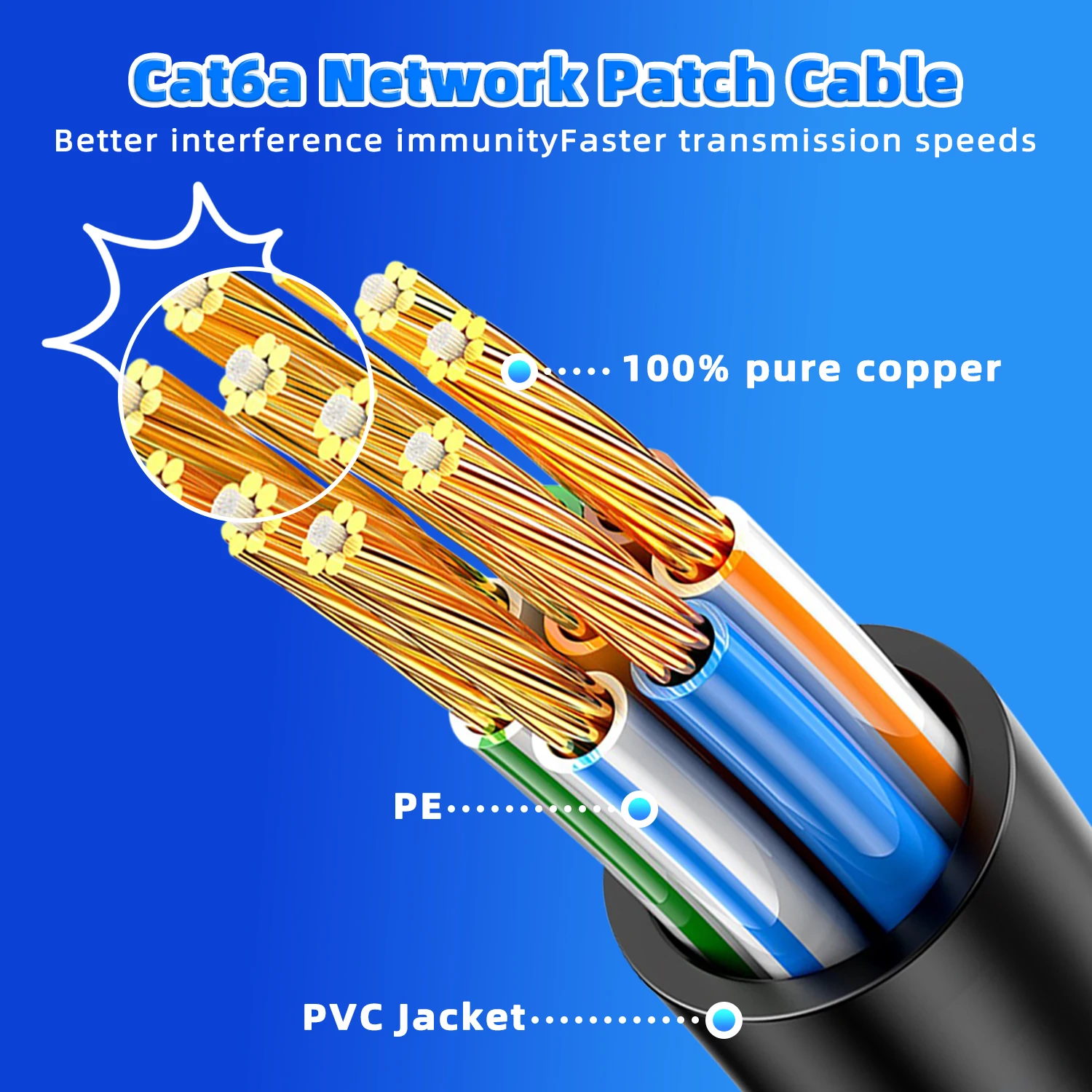 Velocidades de cable Ethernet Cat 6a de hasta 10 Gpbs. Los cables Ethernet delgados Cat6a de 550 Mhz de alto ancho de banda proporcionan una transferencia de datos rápida y de alta velocidad para aplicaciones de servidor, almacenamiento en la nube, chat de video, transmisión de video en línea de alta definición y más.