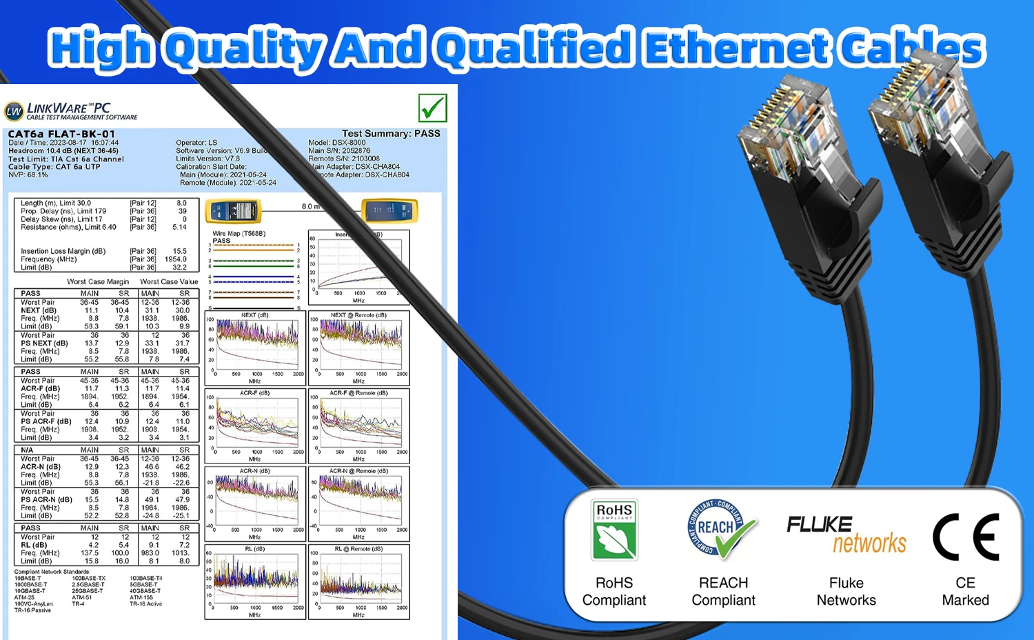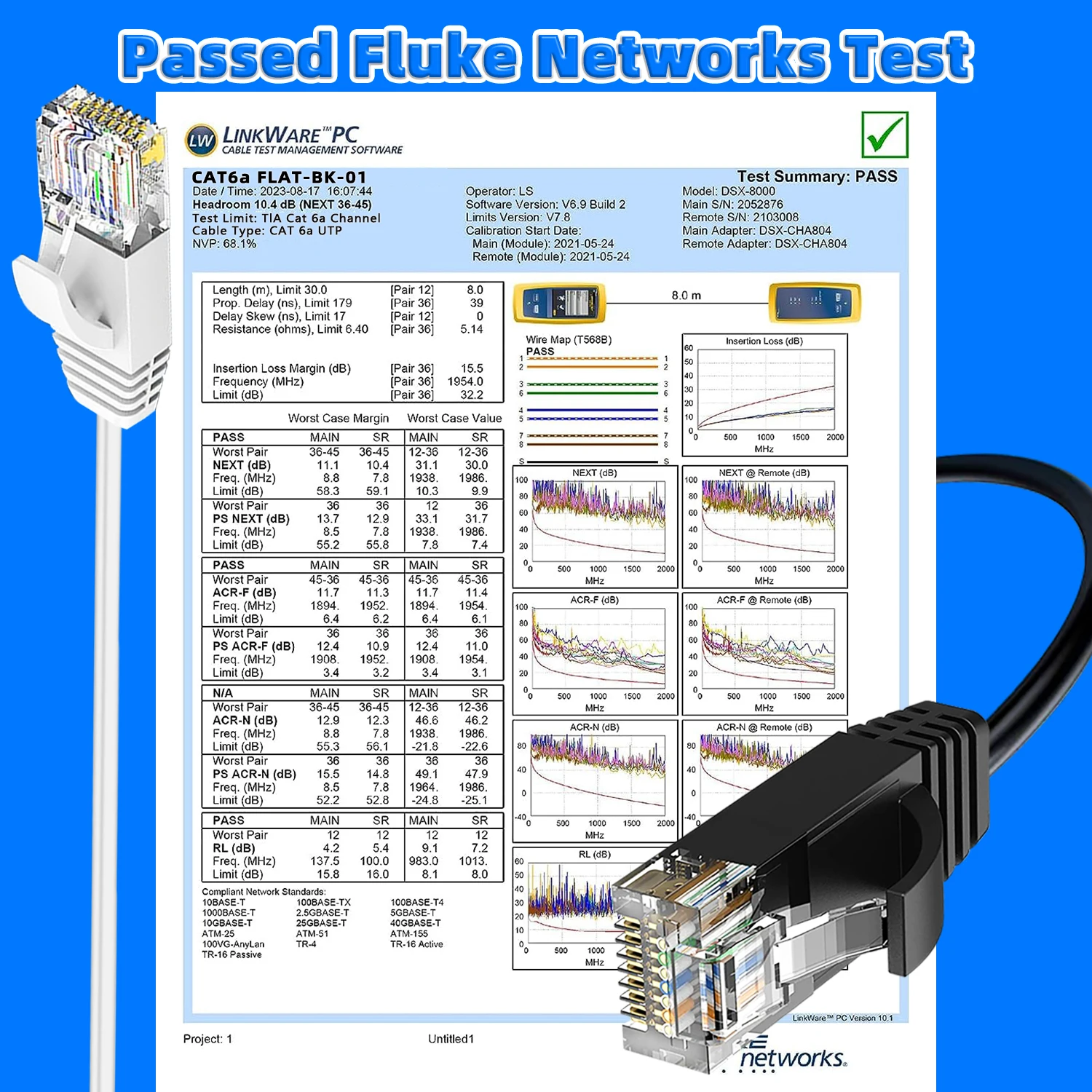 Cables Ethernet Cat6a hechos de cables de cobre trenzados 100% y son aprobados y certificados por Fluke (resultado de la prueba anterior).