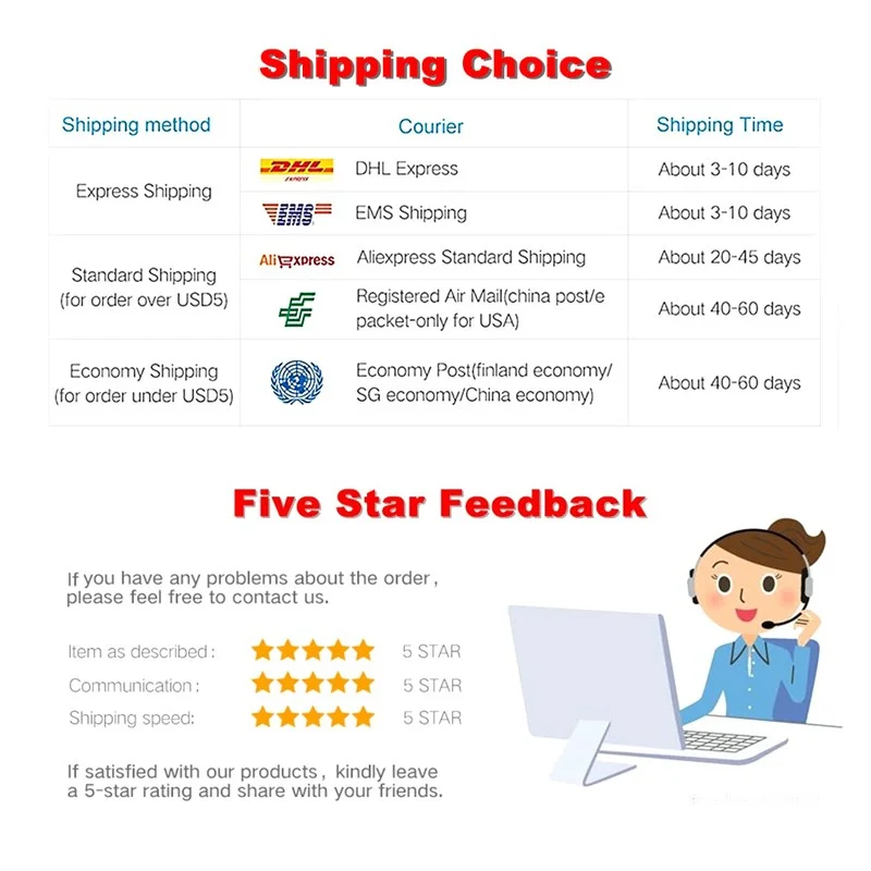★ Si elige logística estándar, el tiempo de entrega es de aproximadamente 15 a 35 días según la distancia desde China.El número de seguimiento se puede verificar a través del sitio web de logística para obtener información de seguimiento de logística.