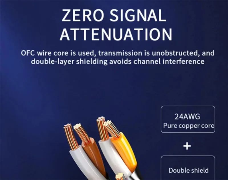 Se utiliza núcleo de cable OFC, la transmisión no tiene obstáculos y el blindaje de doble capa evita la interferencia del canal.