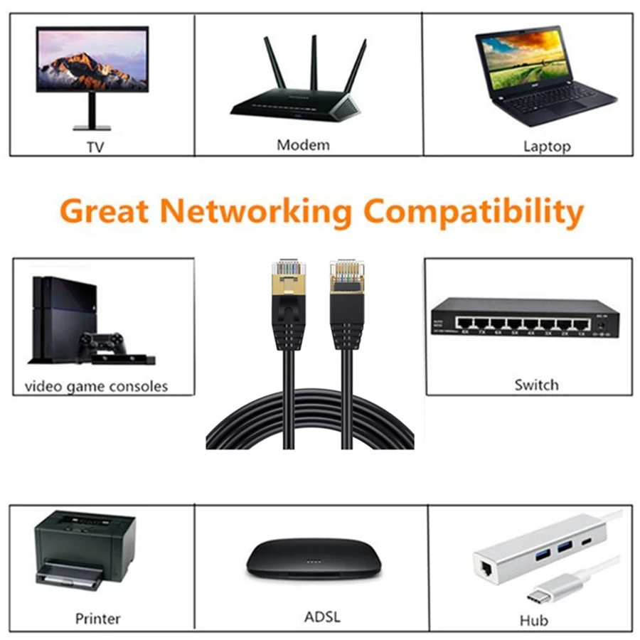 Los cables Ethernet de red ofrecen conectividad universal a computadoras y componentes de red, como enrutadores, conmutadores, concentradores, impresoras de red, cajas de juegos y dispositivos de almacenamiento conectados a la red, Xbox, PS2,PS3, ps4 y cajas de juegos con puerto RJ45.
