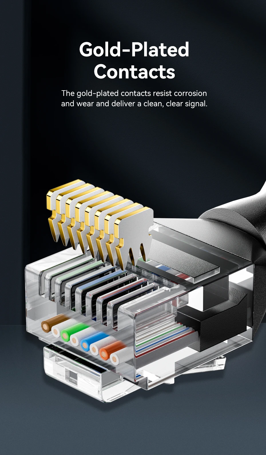 Los contactos chapados en oro resisten la corrosión y el desgaste y brindan una señal limpia y clara.