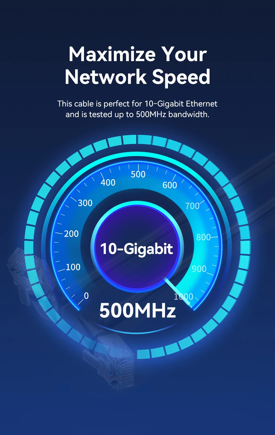 Este cable es perfecto para Ethernet de 10 Gigabit y se prueba con un ancho de banda de hasta 500 MHz.