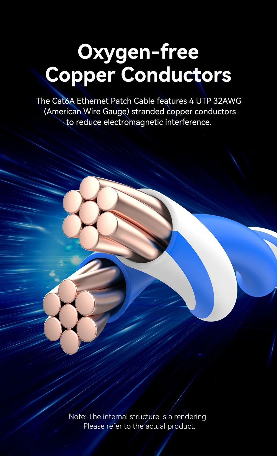 El cable de conexión Ethernet Cat6A cuenta con 4 conductores de cobre trenzado UTP de 32 AWG (medidor de alambre americano) para reducir la interferencia electromagnética.