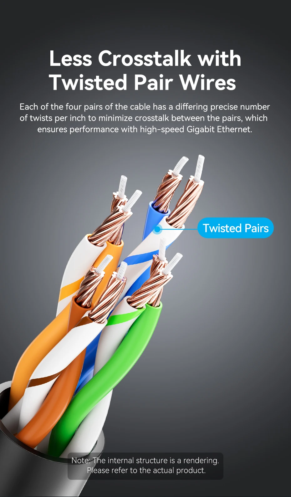 Cada uno de los cuatro pares de cables tiene un número preciso diferente de torsiones por pulgada para minimizar la diafonía entre los pares, lo que garantiza un rendimiento con Gigabit Ethernet de alta velocidad.