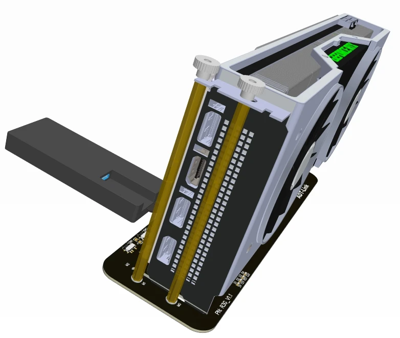 4. El conector de la tarjeta gráfica tiene una hebilla. El bisel PCIe se sujeta con un poste de cobre hexagonal y un tornillo apretado a mano. La tarjeta gráfica compacta no se agitará.