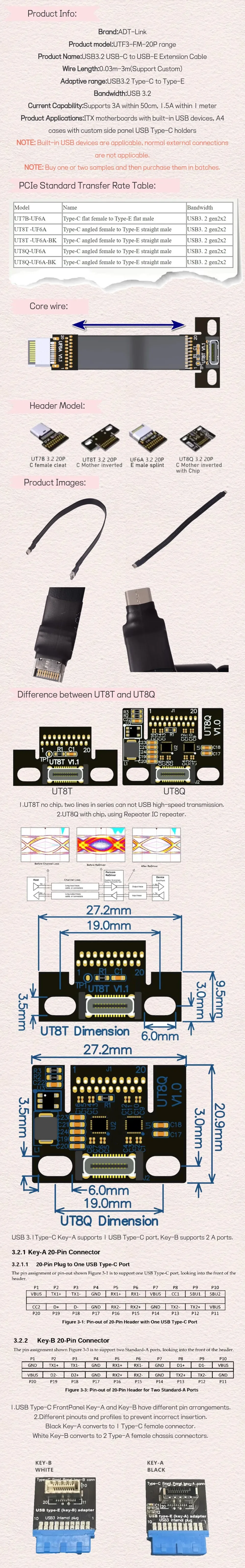 Cable de extensión ADT USB 3,2 tipo C a tipo E 19/20P placa base ITX adaptador de extensión de dispositivo USB incorporado extensor con orificios para tornillos