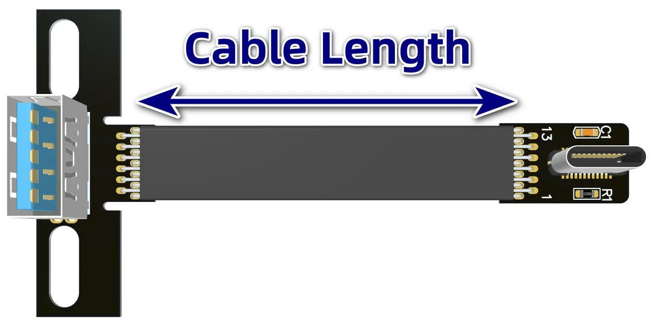 Sin blindaje de metal, este cable utiliza polímero conductor de blindaje EMI, un nuevo tipo de material para blindaje EMI, diseño de cable plano. Esta técnica permite que cada cable esté completamente cubierto por un escudo EMI de polímero conductor para evitar la emisión entrante o saliente de frecuencias electromagnéticas, minimizar la interferencia y la degradación del rendimiento y reducir el peso del extensor.