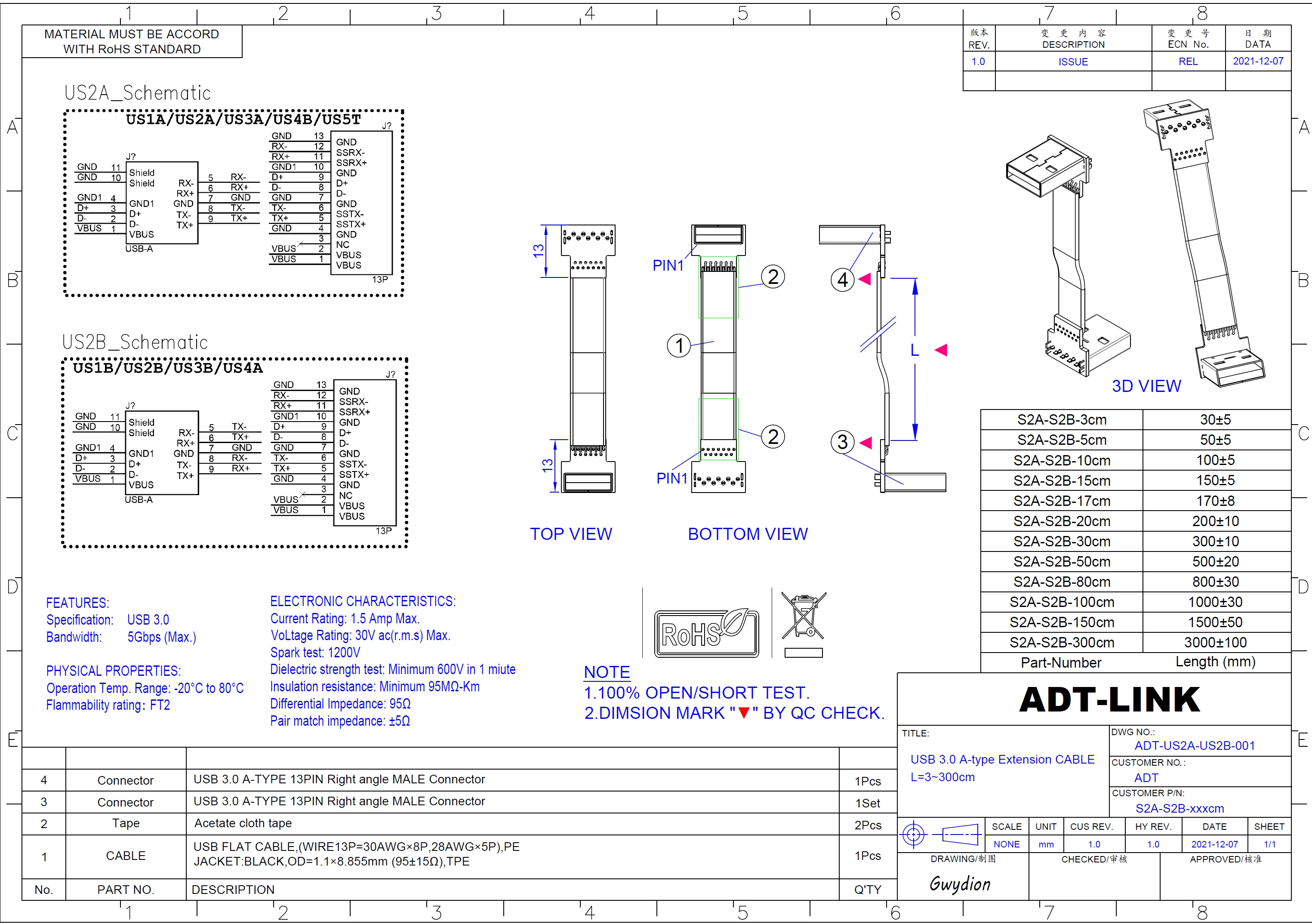 Comprar Cable de extensión de cinta plana ADT personalizado USB 3,0 A macho, ultrafino FPV FPC, tipo A macho A USB A, extensor doble de 90 ángulos