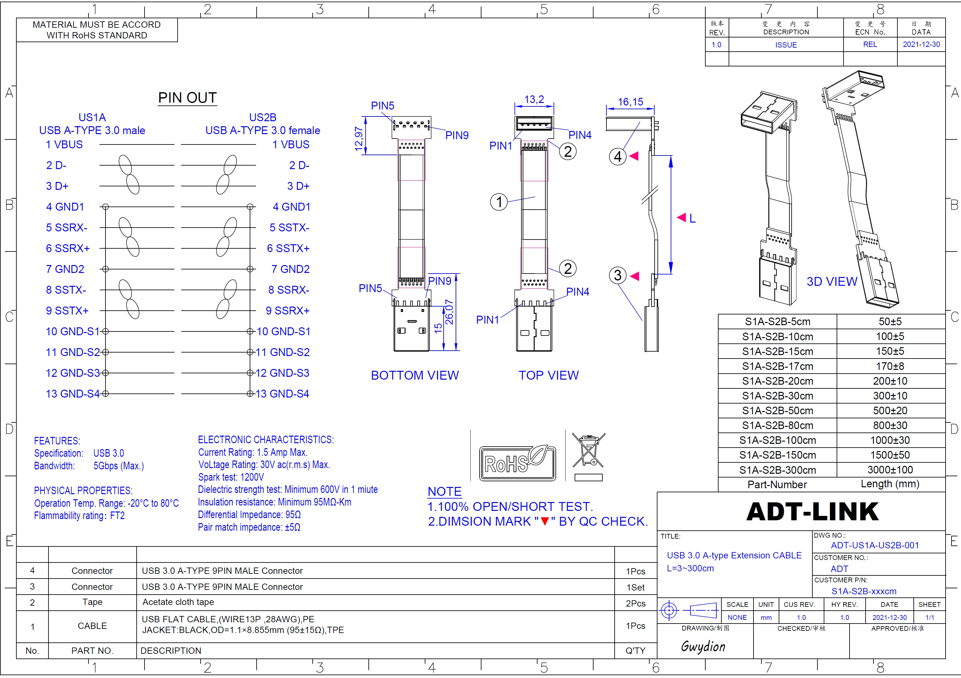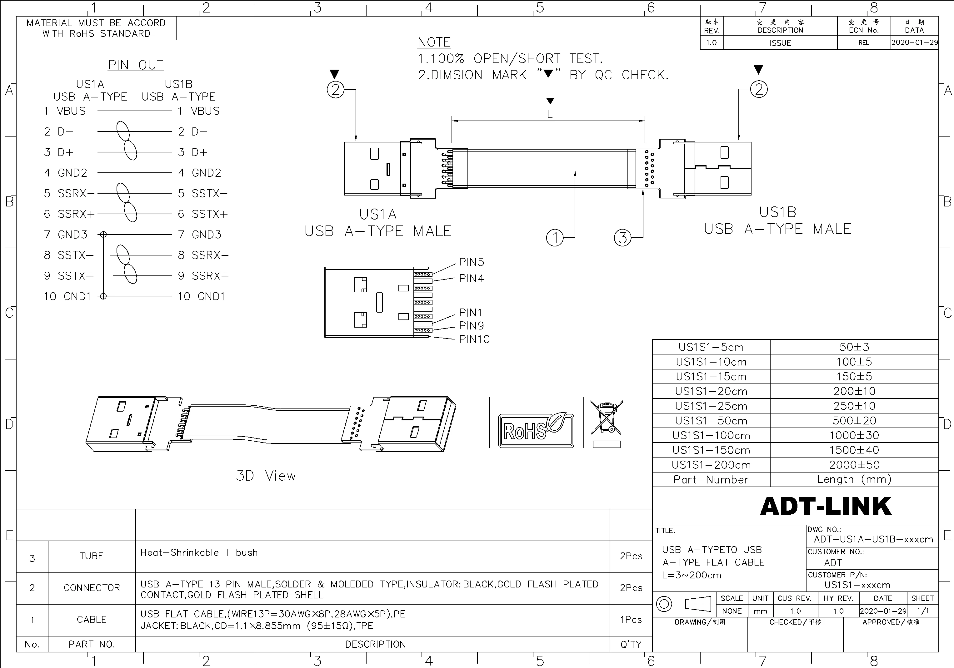 Nombre del producto: cable plano USB 3,0 tipo A macho a tipo A macho