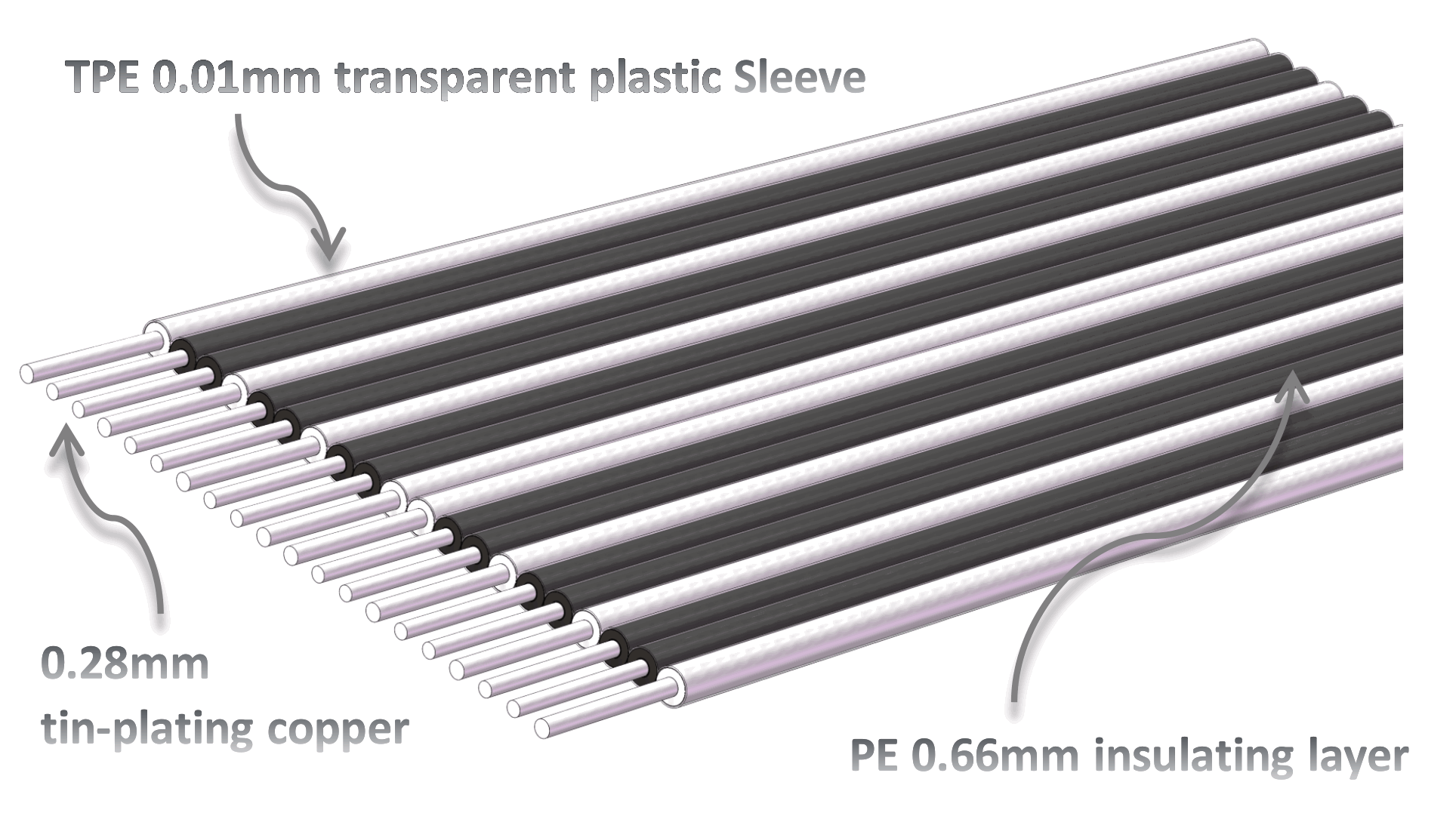 Blindado, utilizando polímeros conductores de blindaje EMI avanzados, nuevos materiales para blindaje EMI, diseño de cable plano. Esta técnica permite que cada cable esté completamente cubierto por blindaje EMI de polímeros conductores para evitar emisiones entrantes o salientes de frecuencias electromagnéticas, minimizando la interferencia y la degradación del rendimiento y reduciendo el peso del producto.