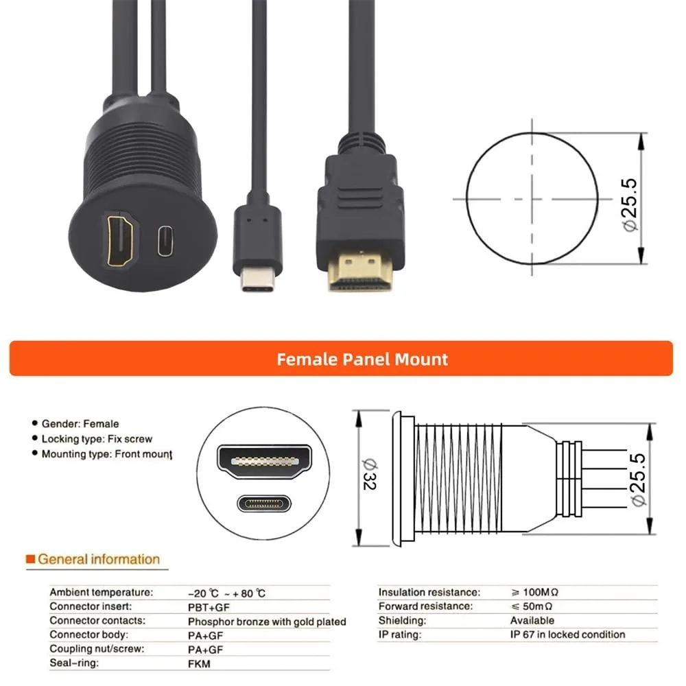 【Compatible con USB C 2.0/3.0 y HDMI1.4】Cable impermeable 2 en 1 de montaje en panel de fijación roscado compatible con USB C + HDMI.USB C2.0 admite velocidad de transferencia de datos 480Mbps, USB C3.0 admite velocidad de transferencia de datos 5Gbps y carga 5V/3A, compatible con HDMI1.4 para sistema de entretenimiento en el automóvil, admite 4K@60HZ, 3840*2160, transmisión de señal de audio y video HD 1080P.