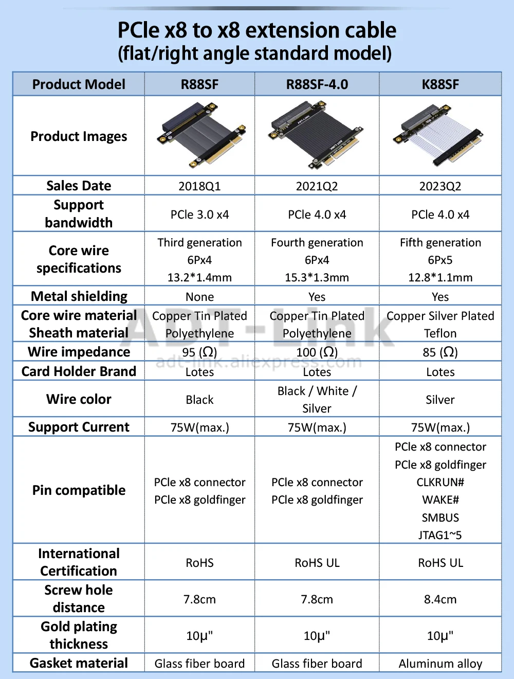 (2023 nuevo tipo)PCIe 4,0x8K88SLCables de extensión de ángulo recto vertical PCI-E x8 a X8 con giro de 90 grados(2023 nuevo tipo)PCIe 4,0x8K88ABCables de extensión vertical de férula PCI-E x8 a X8 con giro de 180 grados (cables duales)