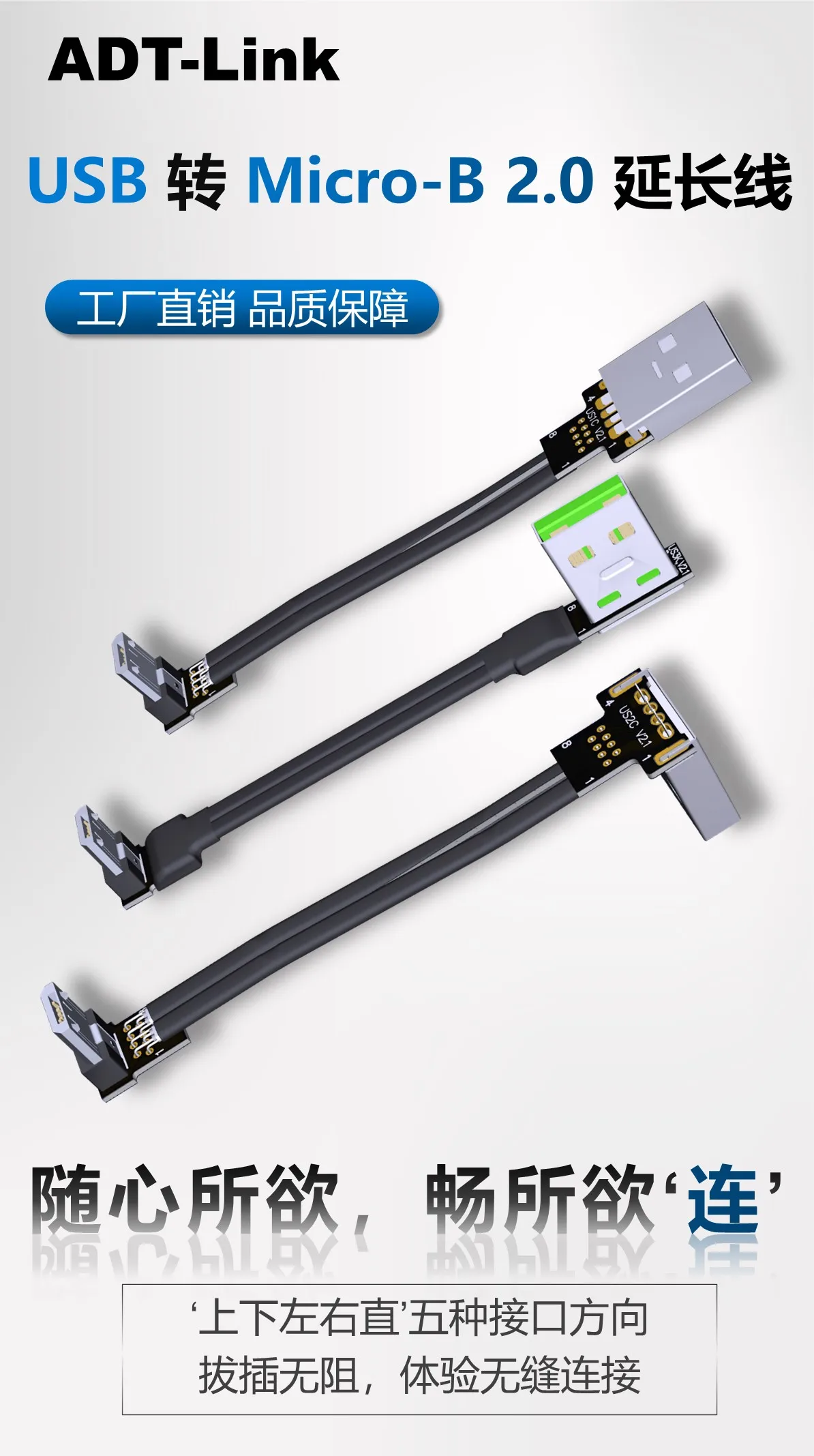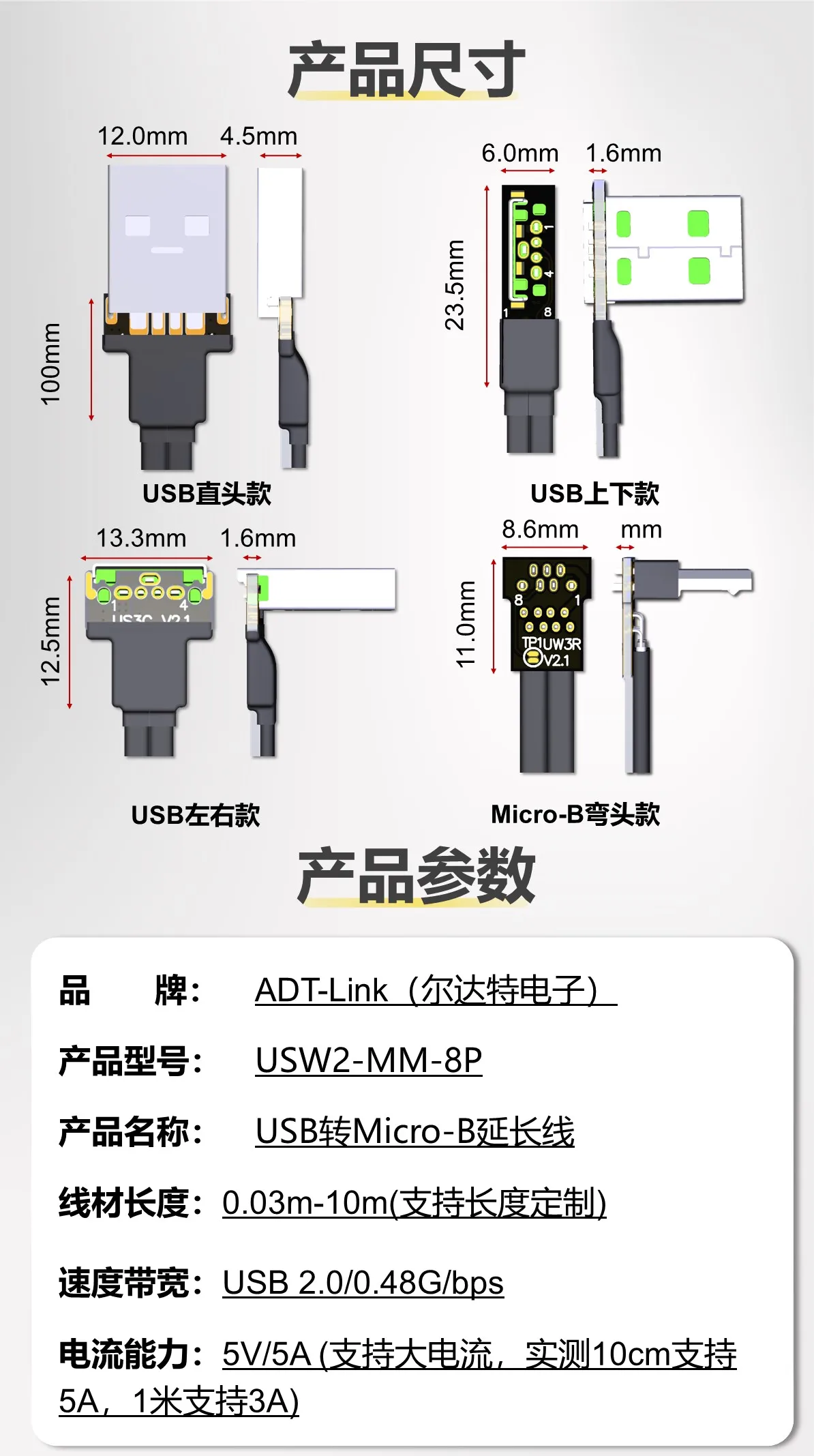 MarcaNúmero de piezaDescripción del productoADTLINKUS1C-UW3RUSB 2,0 Tipo-A Macho recto a Micro-B Cable plano macho de curva ascendenteADTLINKUS2C-UW3RUSB 2,0 Tipo-A Down-Bend macho a Micro-B Up-Bend macho cable planoADTLINKUS1C-UW4USB 2,0 tipo A recto macho a Micro-Cable plano hembra BADTLINKUS2C-UW4USB 2,0 Tipo-A Down-Bend macho a Micro-B hembra cable planoVentajas del producto: