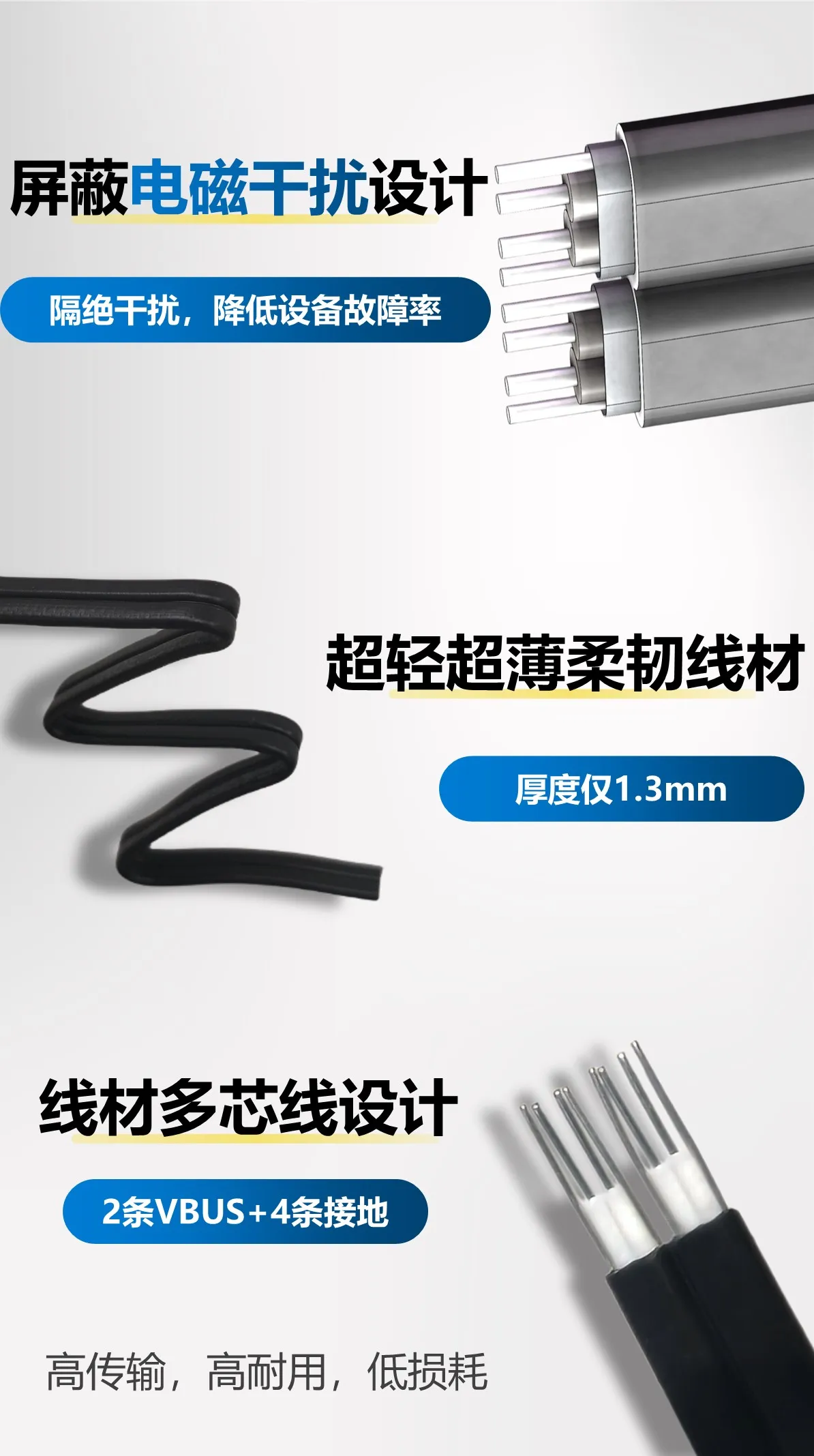 I. Ventajas del cable, diseñado por ADT utilizando el cable, el cable es ligero, delgado y plano, y el cable central está blindado con papel de aluminio para antiinterferencias